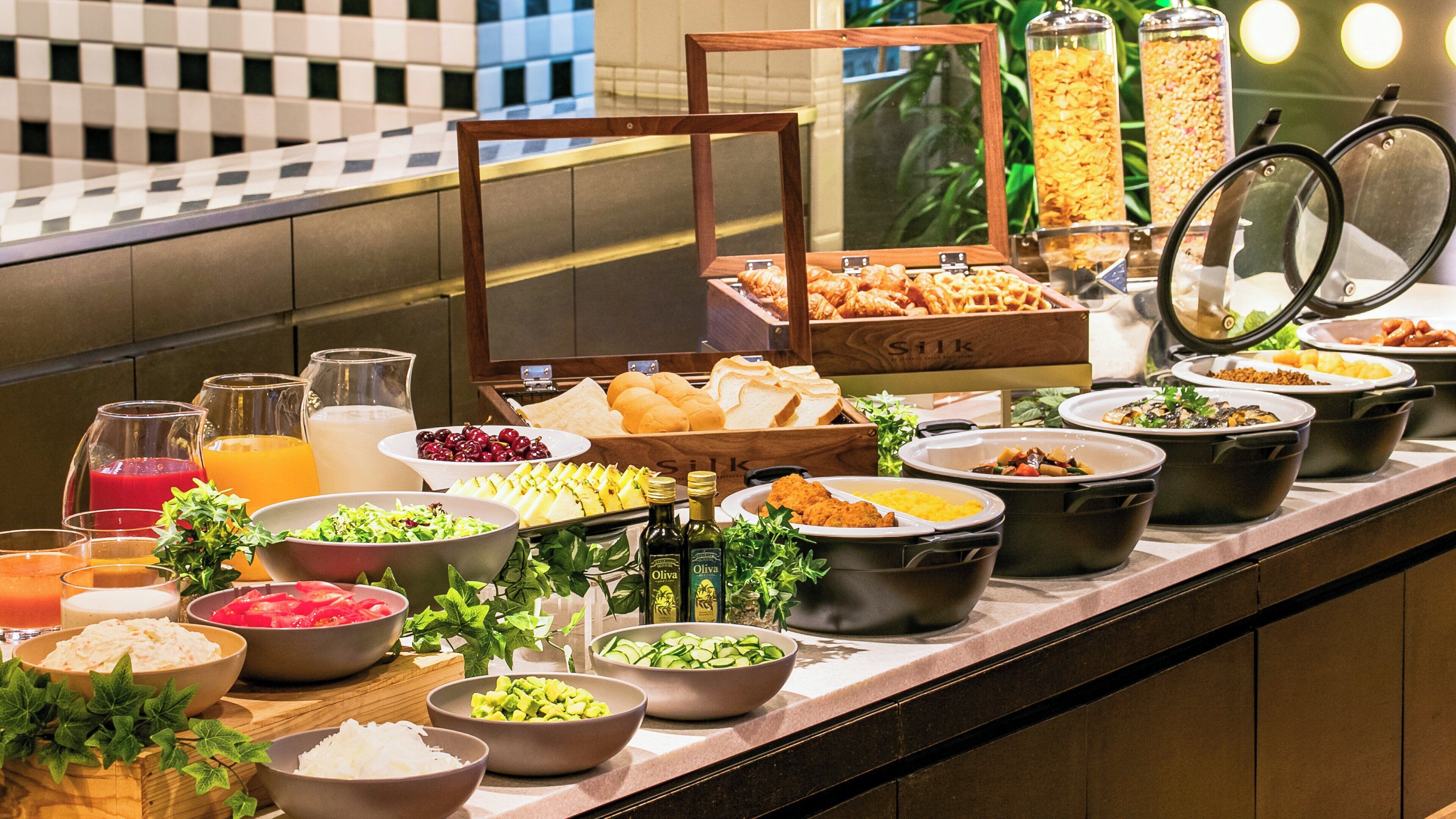ブッフェスタイルの朝食はイートウェルのコンセプトに基づいた栄養価の高いメニュー。季節のフルーツや、さわやかなジュースとスムージー、新鮮な野菜、スーパーフードのサラダトッピング、自家製ミューズリー、焼きたてのペストリーとパンが並びます。