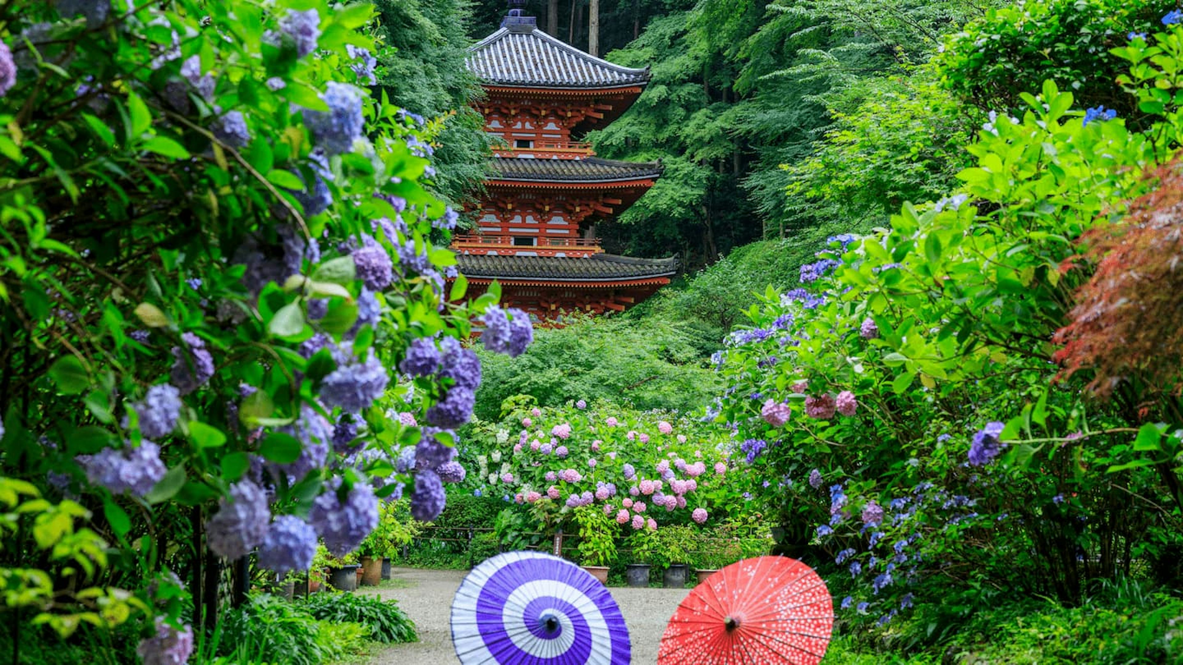 紫陽花の種類によって色や形が異なるので、各寺社をめぐって比較してみるのも楽しいですよ。雨の日は傘を片手に、しっとりとした雰囲気の中で紫陽花鑑賞を楽しんでみてはいかがでしょうか。