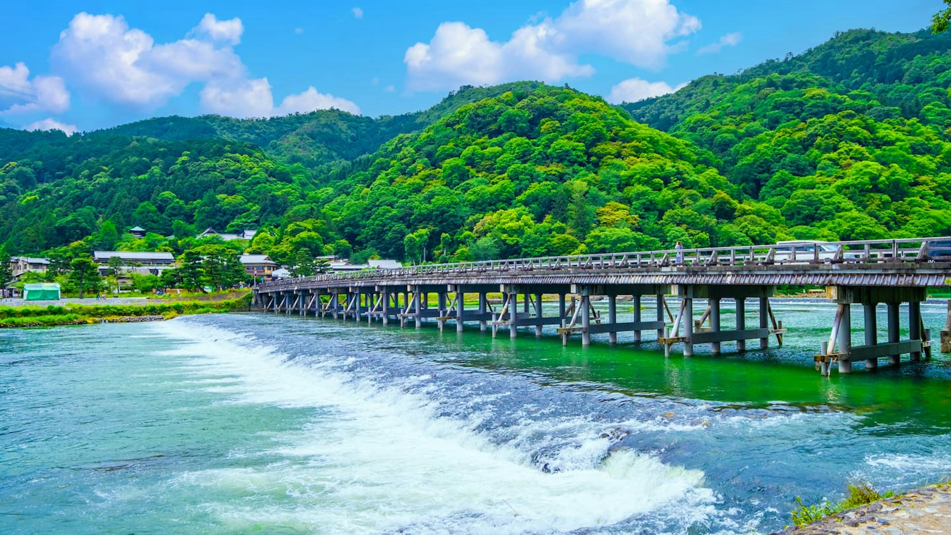 少し歩くと、目の前に有名な渡月橋が現れます。橋を渡れば嵐山の中心部に到着です。歩道は整備されていますが、観光客で混雑することがあるので、周囲に注意しながら歩きましょう。