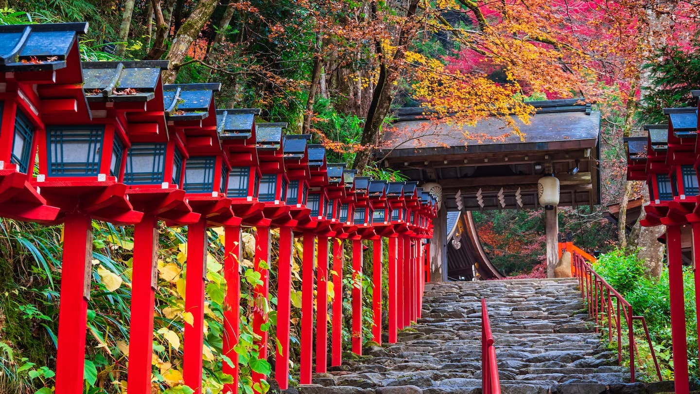 秋の貴船神社は紅葉の名所として有名です。貴船神社を囲む森の紅葉は美しく、特に夜間のライトアップが行われる「京の奥座敷 貴船もみじ灯篭」は必見!また、参道の赤い灯籠と石段を囲む赤や黄に染まった木々は、期間限定の色とりどりの光景を見せてくれます。境内の紅葉も美しく、圧巻の光景が広がります。