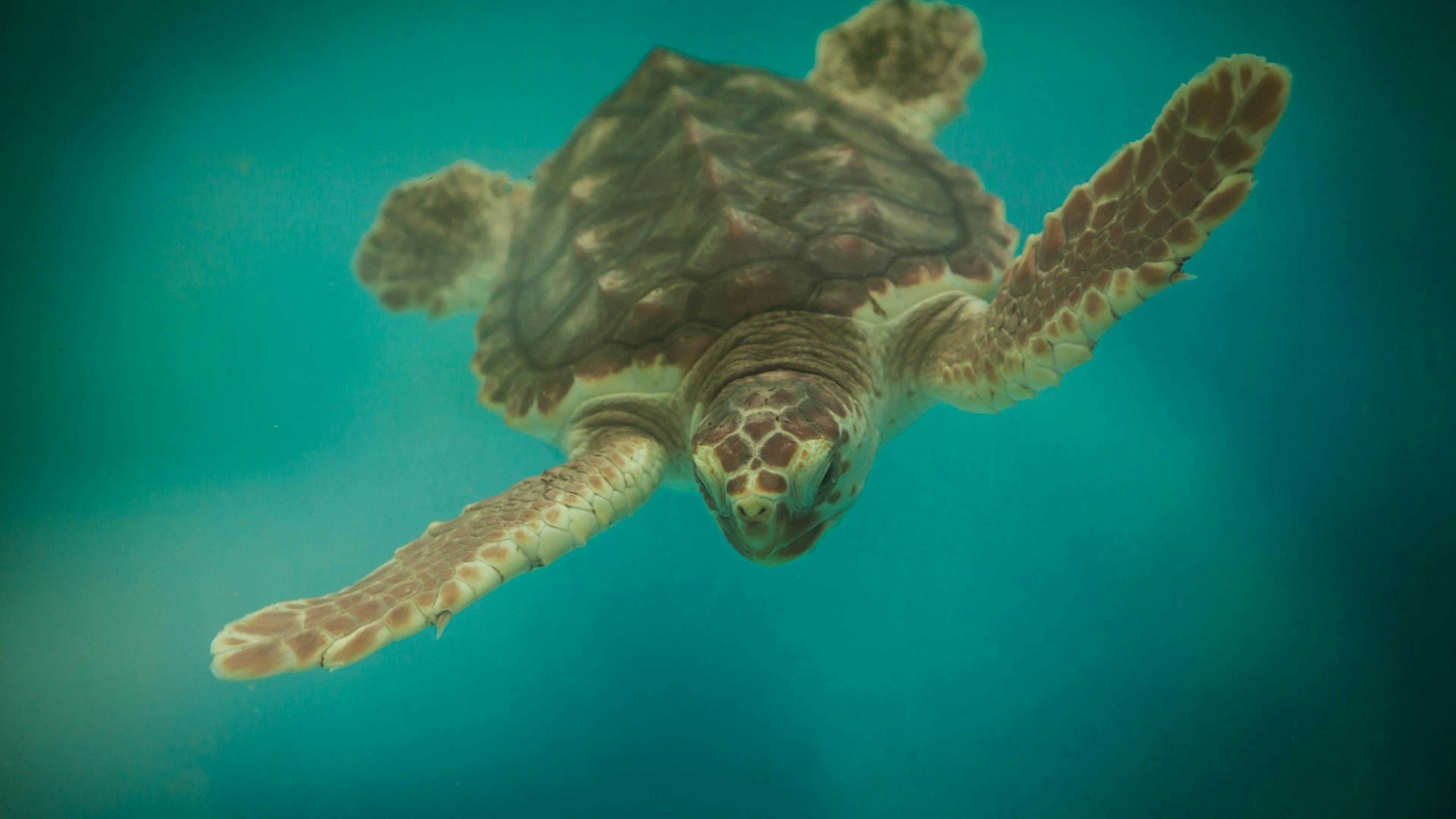 アカウミガメは、貝類や甲殻類などの小動物を食べる肉食のウミガメ。日本沿岸で生まれた個体は太平洋を横断してメキシコやアメリカ沿岸に渡り、ある程度成長してから再び日本近海に戻り、産卵します。