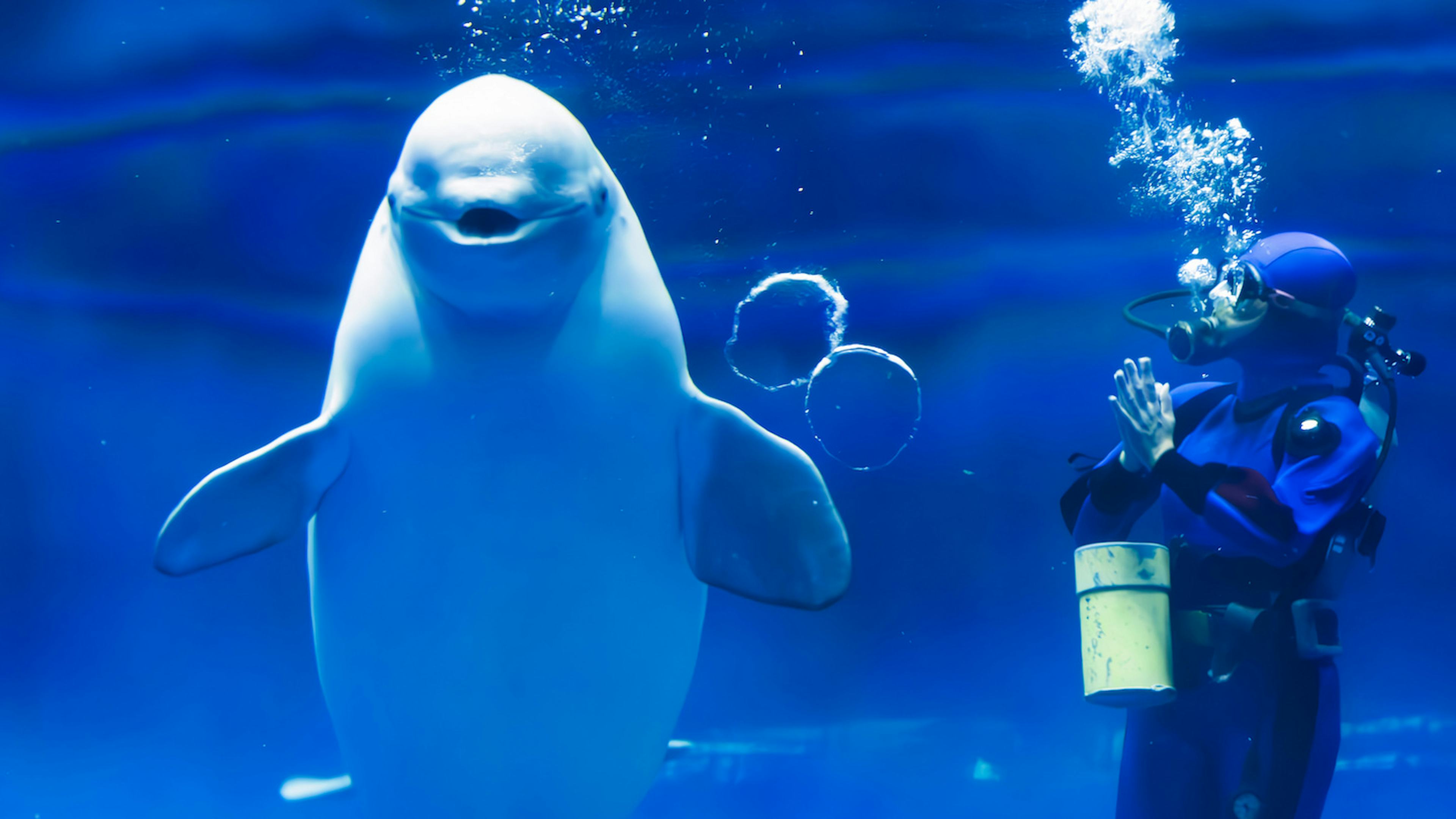 シロイルカはかわいい表情とバブルリングなどの芸で知られる水族館の人気者。日本では4カ所の水族館でしか見ることができません。