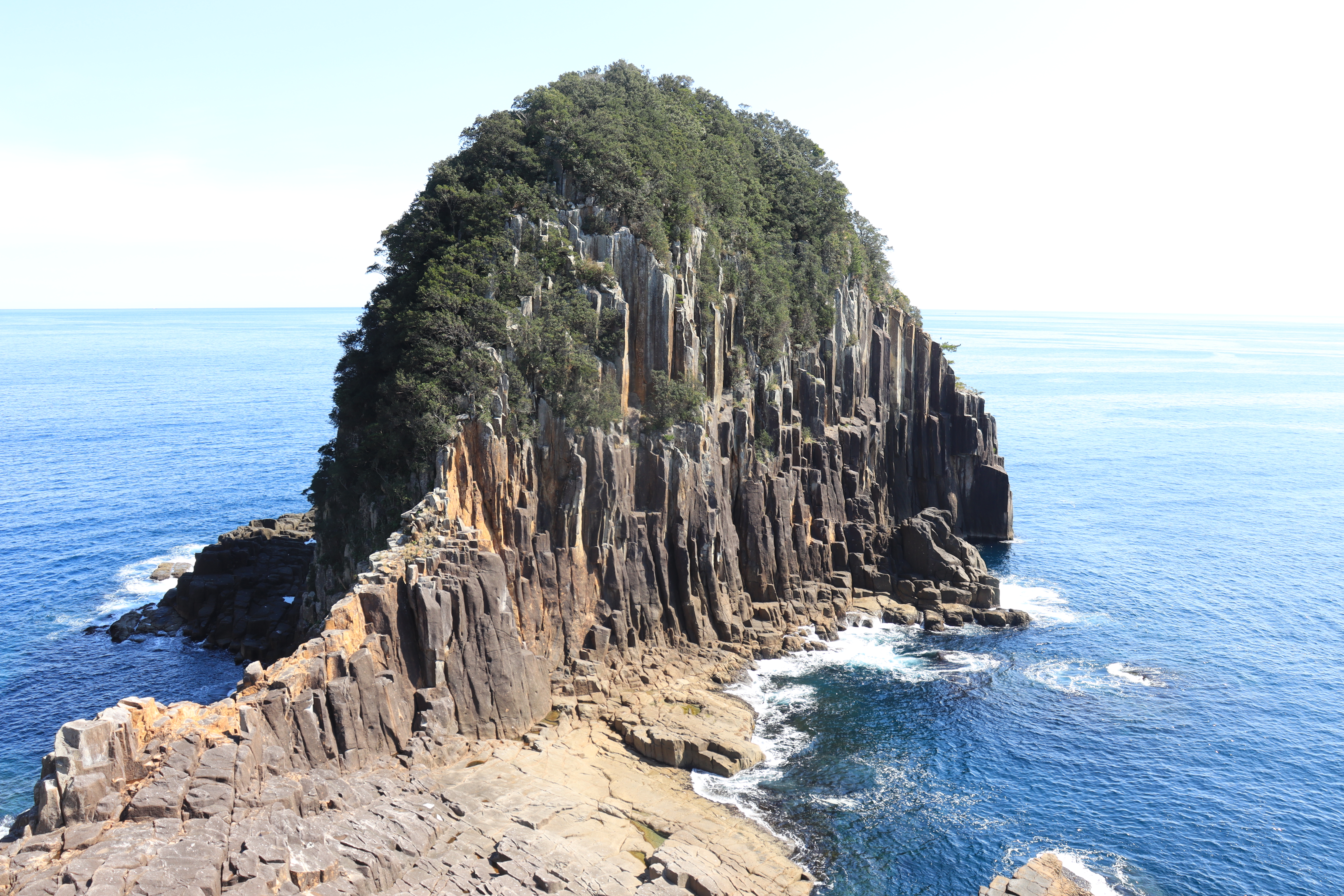 「楯ヶ崎」は、まるで神様が巨大な盾を立てたかのような、圧倒的な迫力を誇る大岩壁です。高さ約80m、周囲約550mにも及ぶこの絶壁は、「柱状節理(ちゅうじょうせつり)」と呼ばれる、角ばった柱を束ねたような独特の地形でできています。その規則正しくも荒々しい姿は、まさに自然が創り出した偉大な彫刻作品! この神秘的な場所には、日本の初代天皇である神武天皇が上陸したという伝説も残っています。陸から遊歩道を歩いてその迫力を間近に感じることもできますが、おすすめは「楯ヶ崎観光遊覧」の船に乗って海から眺めること!海上から見上げる楯ヶ崎のスケール感は格別です。さらに、船でしか見られない「青の洞窟」と呼ばれる「がまの口」や、楯ヶ崎を上回る高さの絶壁「海金剛」など、感動的なアクティビティが待っています。