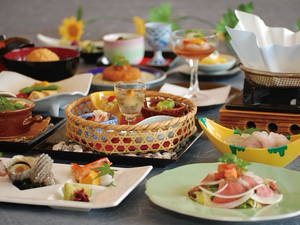 夕食は、料理長が厳選した旬の食材をふんだんに使用した本格会席料理。「温かいものは温かいうちに、冷たいものは冷たいうちに」という料理哲学のもと、一品一品丁寧に運ばれてきます。季節ごとの会席コースには、地元・伊勢志摩の味覚が詰まっています。創作の和食会席を月替わりでご用意しております。季節の前菜から始まり、新鮮なお造り、黒毛和牛の逸品、そして季節の釜飯まで、目にも美しい料理の数々が並びます。