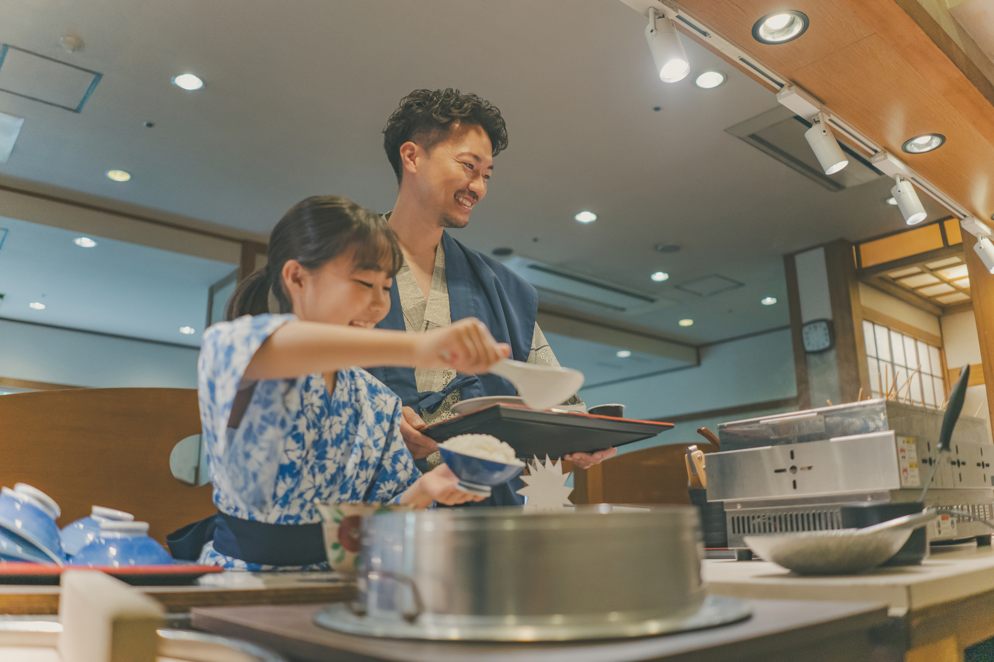 また、館内の「遊び処」には卓球やビリヤードが楽しめるゲームコーナー(30分700円)があり、家族みんなでにぎやかに過ごすことも。本館の朝食会場「ダイニング大河」では、地元の旬の食材をふんだんに使ったビュッフェを堪能でき、ライブキッチンでの出来立てのお料理に子どもたちもきっと喜ぶはず。