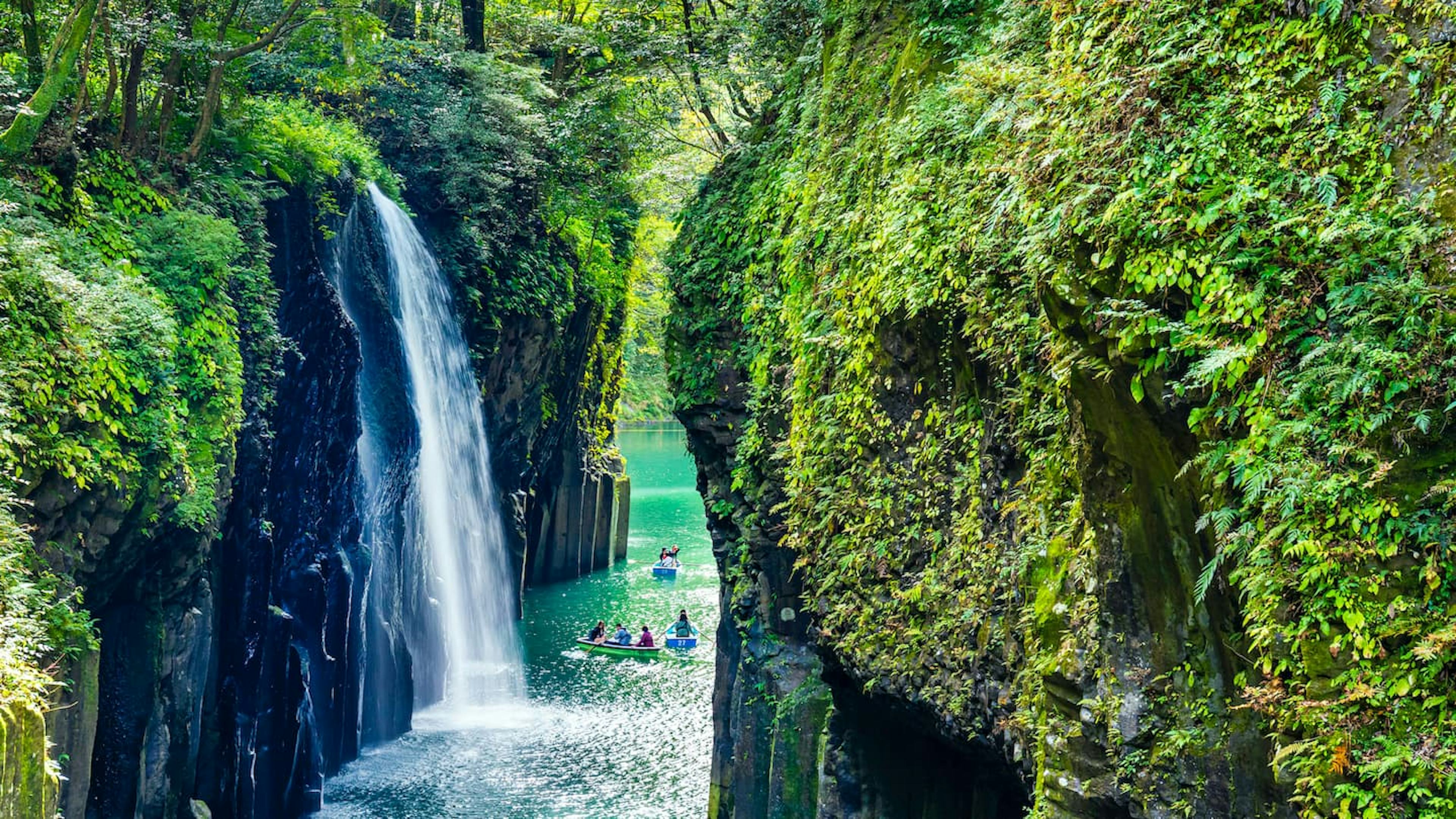 高千穂峡は、宮崎県を代表する絶景スポットとして知られています。深さ約80mの峡谷に、透き通った水が流れる姿は圧巻です。特に、落差17mの真名井の滝は、パワースポットとしても人気があり、多くの観光客を魅了しています。