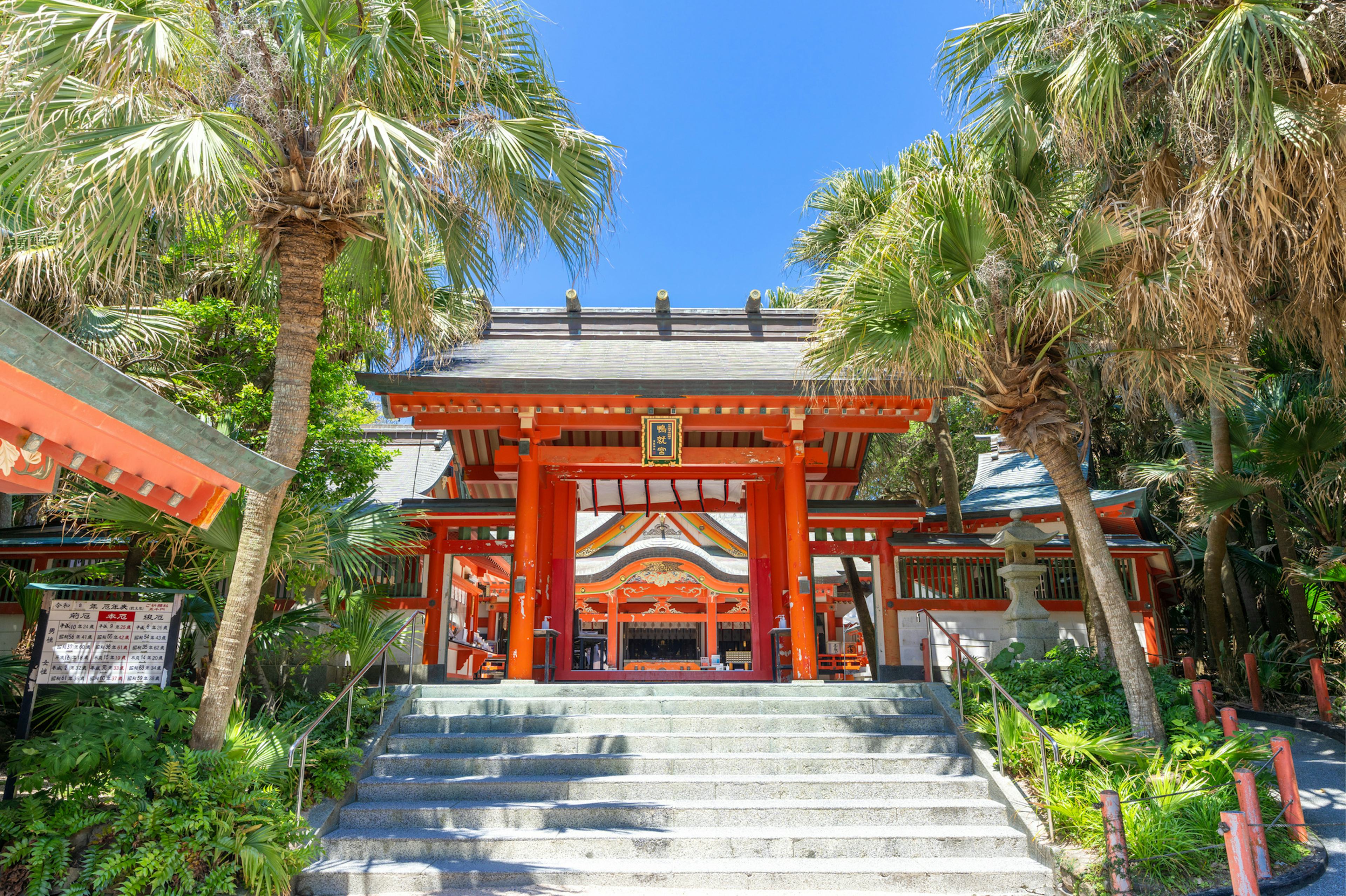 青島は、宮崎市の沖合約1.5kmに浮かぶ小さな島で、神話の舞台として有名です。島全体が亜熱帯植物の宝庫で、国の天然記念物に指定されています。青島神社は、海幸彦・山幸彦の神話にゆかりのある神社で、縁結びのパワースポットとしても人気の場所。