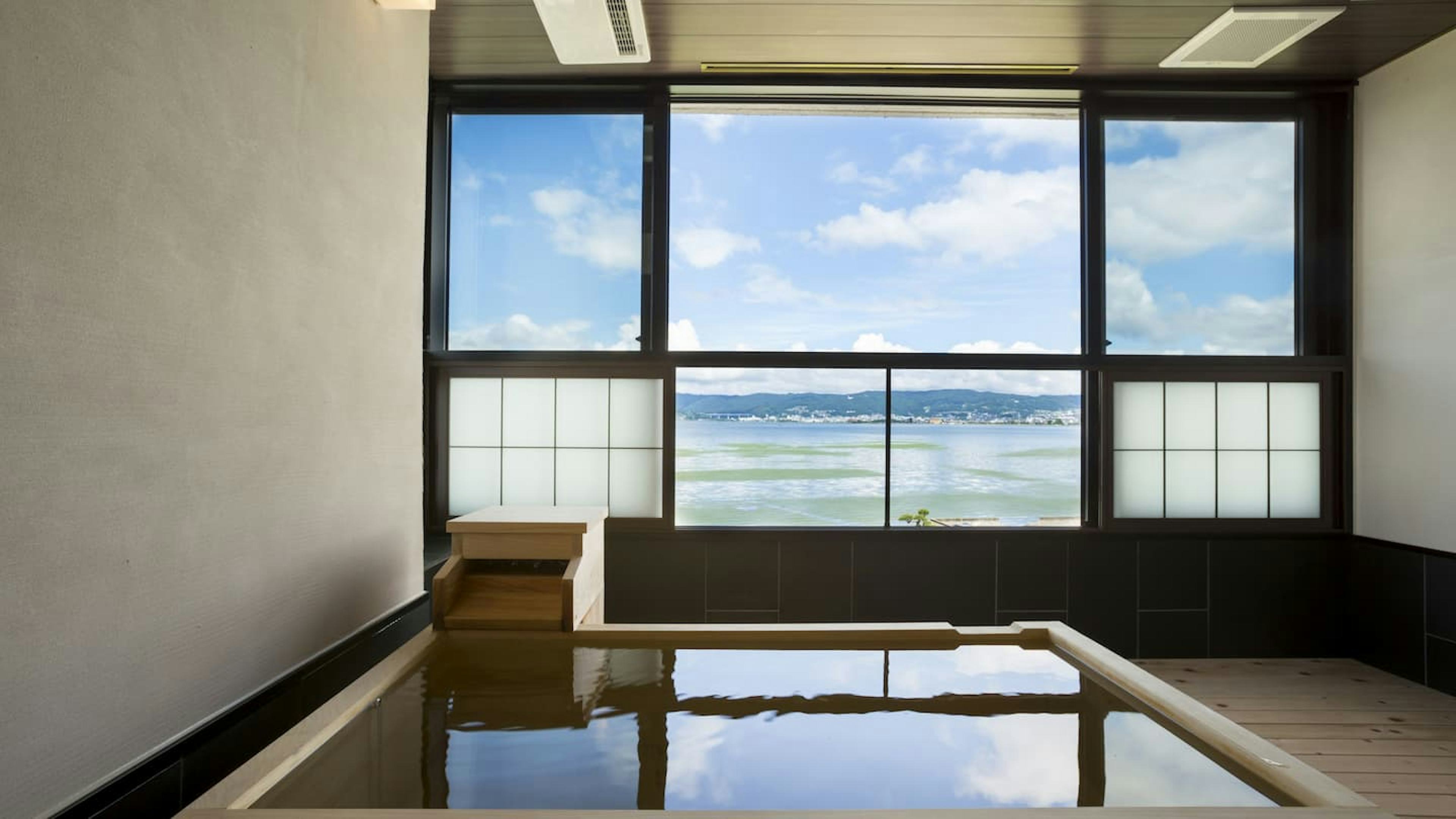 また、屋上にある展望露天風呂からはより開放的な絶景も。諏訪湖と露天風呂が一体になったかのようなインフィニティな感覚で、広々と快適な入浴を楽しめます。