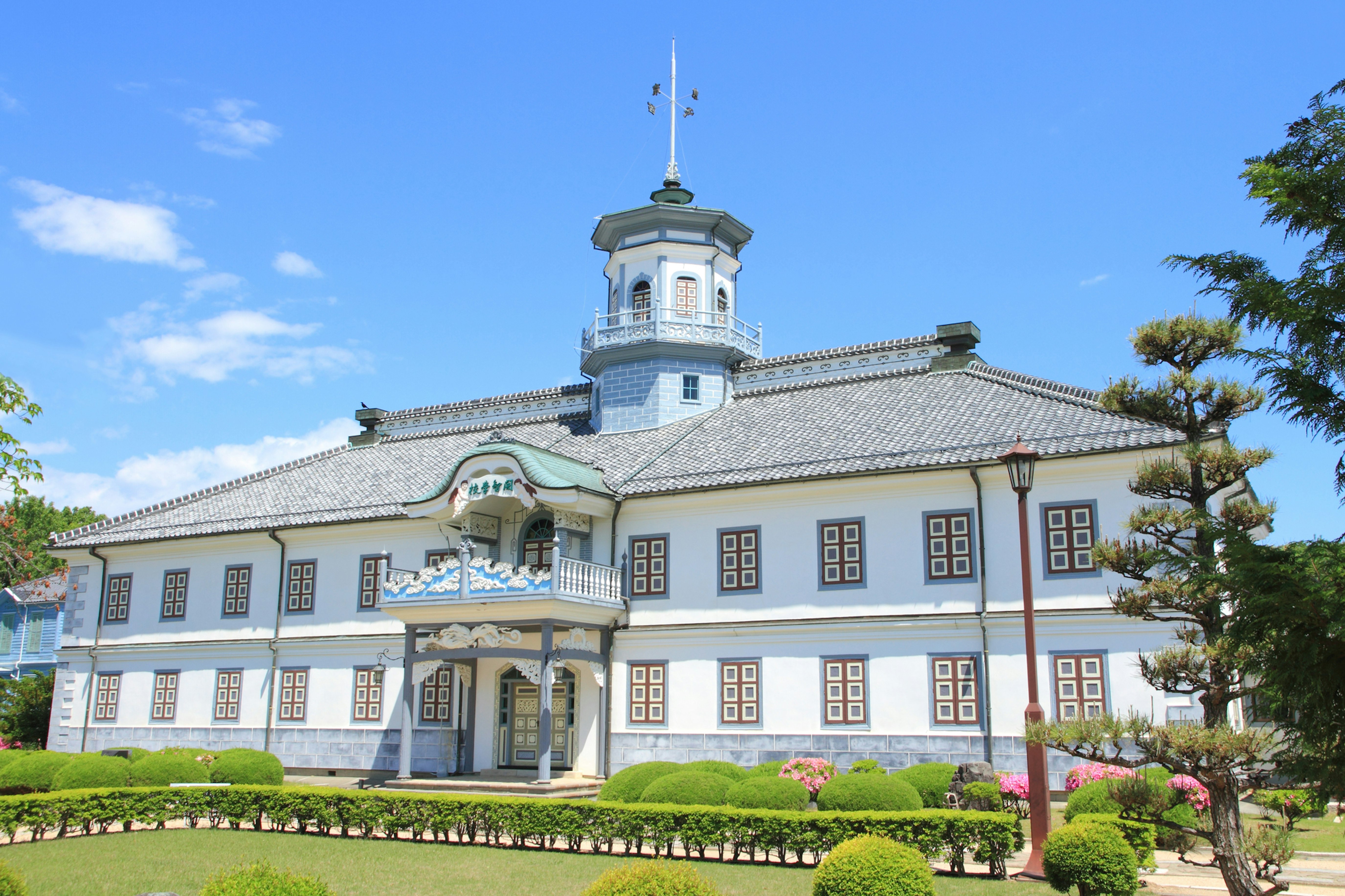 校舎の外観は、八角塔や唐破風(からはふ)など和風の要素と、ガラス窓やスレート屋根などの洋風の要素が融合した独特のデザインが使用されているんですよ。この建築様式は「擬洋風建築」と呼ばれ、明治時代の日本の近代化を象徴する建物として高く評価されています。