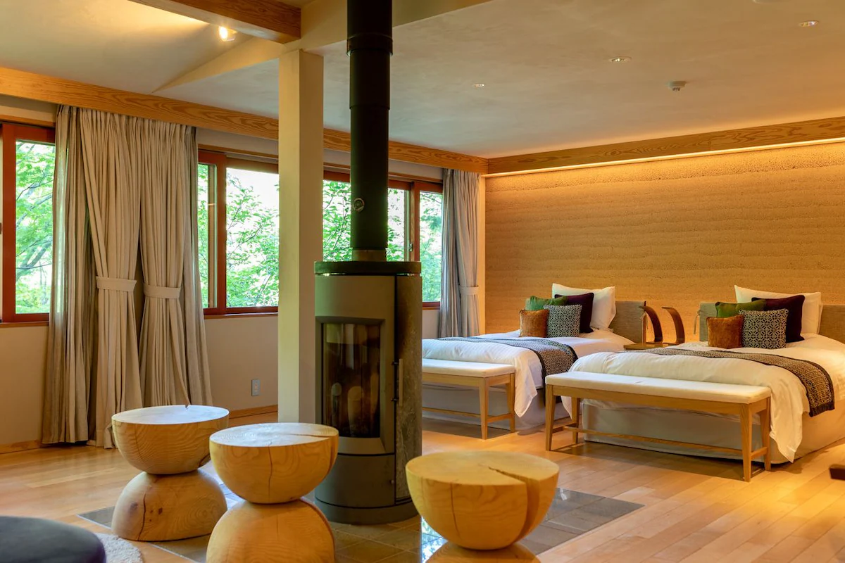 木材の温もりと洗練されたデザインが調和した客室には、旅の疲れを解きほぐすくつろぎが広がっています。記念日旅行には、64㎡のゆとりあるスイートルームがおすすめです。専用ガーデンから鮮やかな緑を眺められ、極上のプライベートタイムを過ごせます。子連れファミリーには、ガーデンつきの客室もおすすめです。12歳以下は添い寝無料など、キッズ対応も充実しています。ロビーには暖炉があり、揺らめく炎と薪の音が心を穏やかにしてくれますよ。軽井沢の別荘文化を感じながら、静寂に包まれた夜を過ごしてみてはいかがでしょうか。