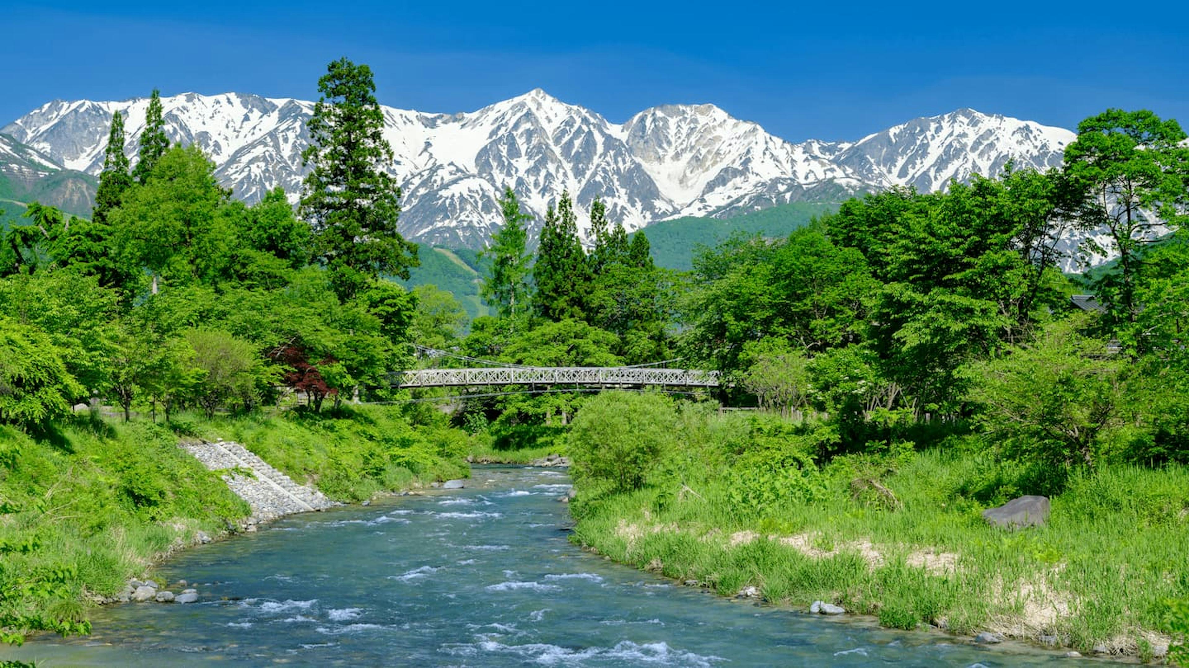 5月は、まだ北アルプスに残雪が残る時期。立山黒部アルペンルートでは、雪の壁や雪渓といった迫力ある雪景色を楽しむことができます。とくに、「雪の大谷」と呼ばれる高さ20メートルにもおよぶ雪の壁は圧巻。