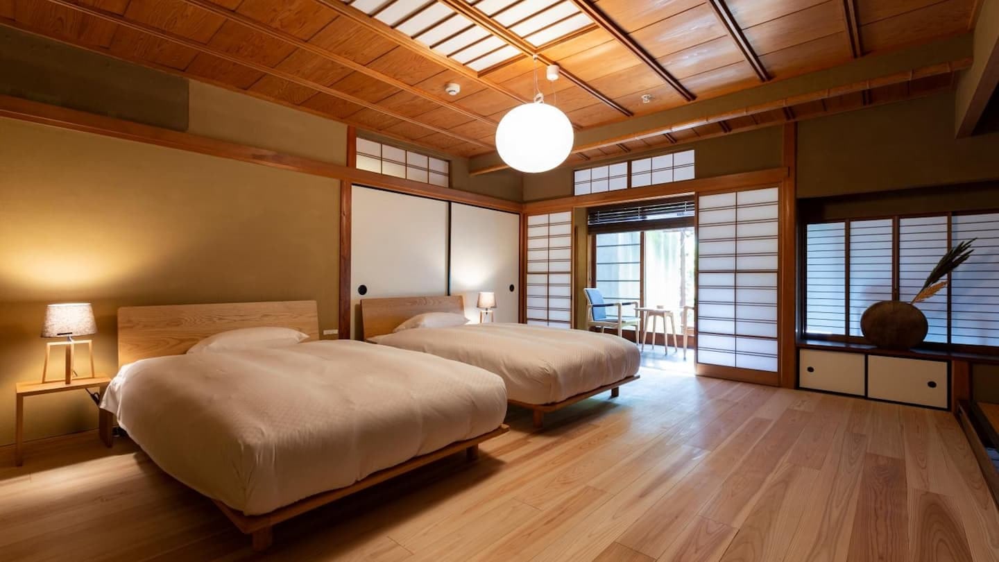 インテリアには地元の木材や和紙が使われているのも特徴のひとつ。和の落ち着きとモダンなデザインが融合したぜいたくな空間で、非日常を満喫できますよ。