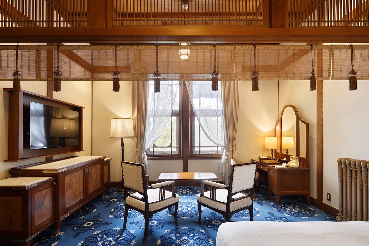明治42年創業の歴史あるホテルは、和風建築に洋風インテリアを調和させたクラシカルな世界観が魅力です。伝統的なデザインが持つ圧倒的な存在感は、現代のホテルにはない独特の温もりと高級感を醸し出しています。