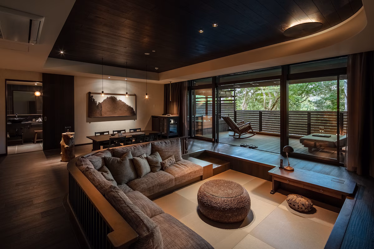 テラスからは愛らしい野生の鹿の姿も望め、非日常感と気軽さを両立しているのが大きな魅力です。奈良の自然とモダンなデザインが融合した空間で、素敵な滞在を存分にお楽しみください。