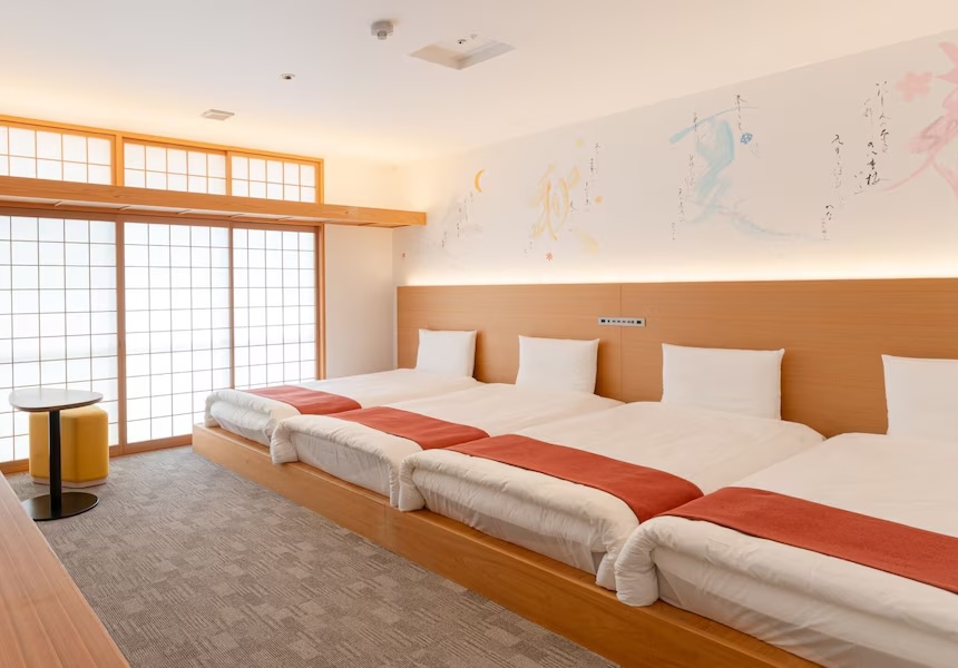 ノボテル奈良の和洋室は約35㎡で、シングルベッド2台に加えて布団一式が用意され、最大4名まで宿泊可能な、日本の美意識と現代的な快適さを兼ね備えた客室です。