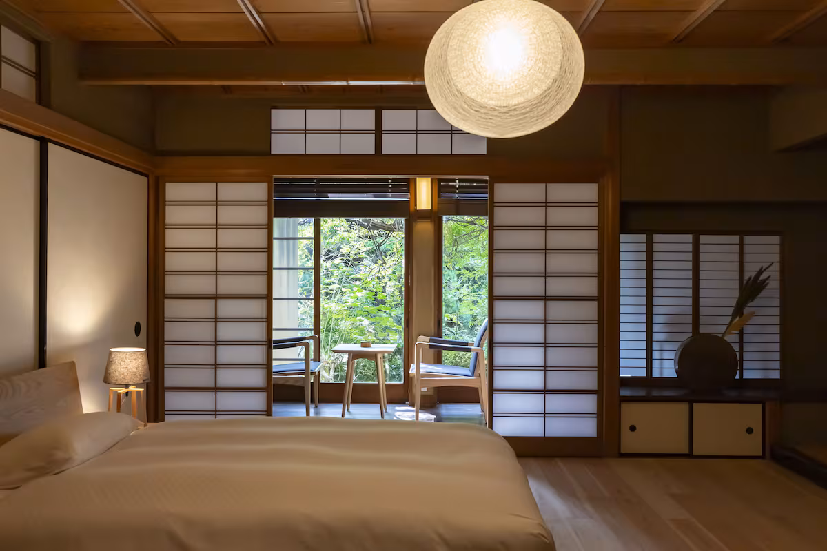 かつての蔵や茶室の面影を残す客室は、日本の伝統美と現代のモダンデザインが絶妙に融合した洗練された空間です。あたたかな行燈風の間接照明が、むき出しになった太い梁や木目の深い陰影を美しく浮かび上がらせてくれます。