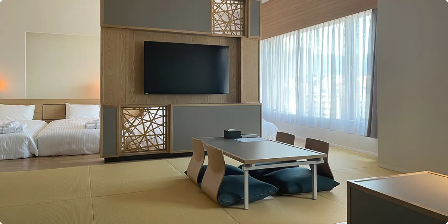最大6名まで宿泊可能な最上級スイート。畳敷きの小上がりスペースがあり、和の情緒たっぷり。最大の特徴は、客室に備えられた「半露天風呂」です。別府の風を感じながら、プライベートな湯浴みを楽しめます。