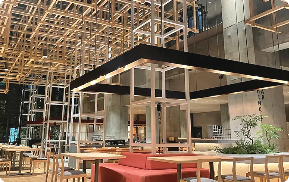 ロビーエリアは、開放的なガラス張りで街との境界を曖昧にし、宿泊客と地域の人々、あるいは別府の風景が自然と交わるように設計されています。ラウンジには別府の伝統工芸品である竹細工が飾られ、モダンな中にも土地の記憶を感じさせる演出が施されています。ここではウェルカムドリンクを楽しむこともでき、旅の移動の疲れを癒やす最初の見どころとなっています。