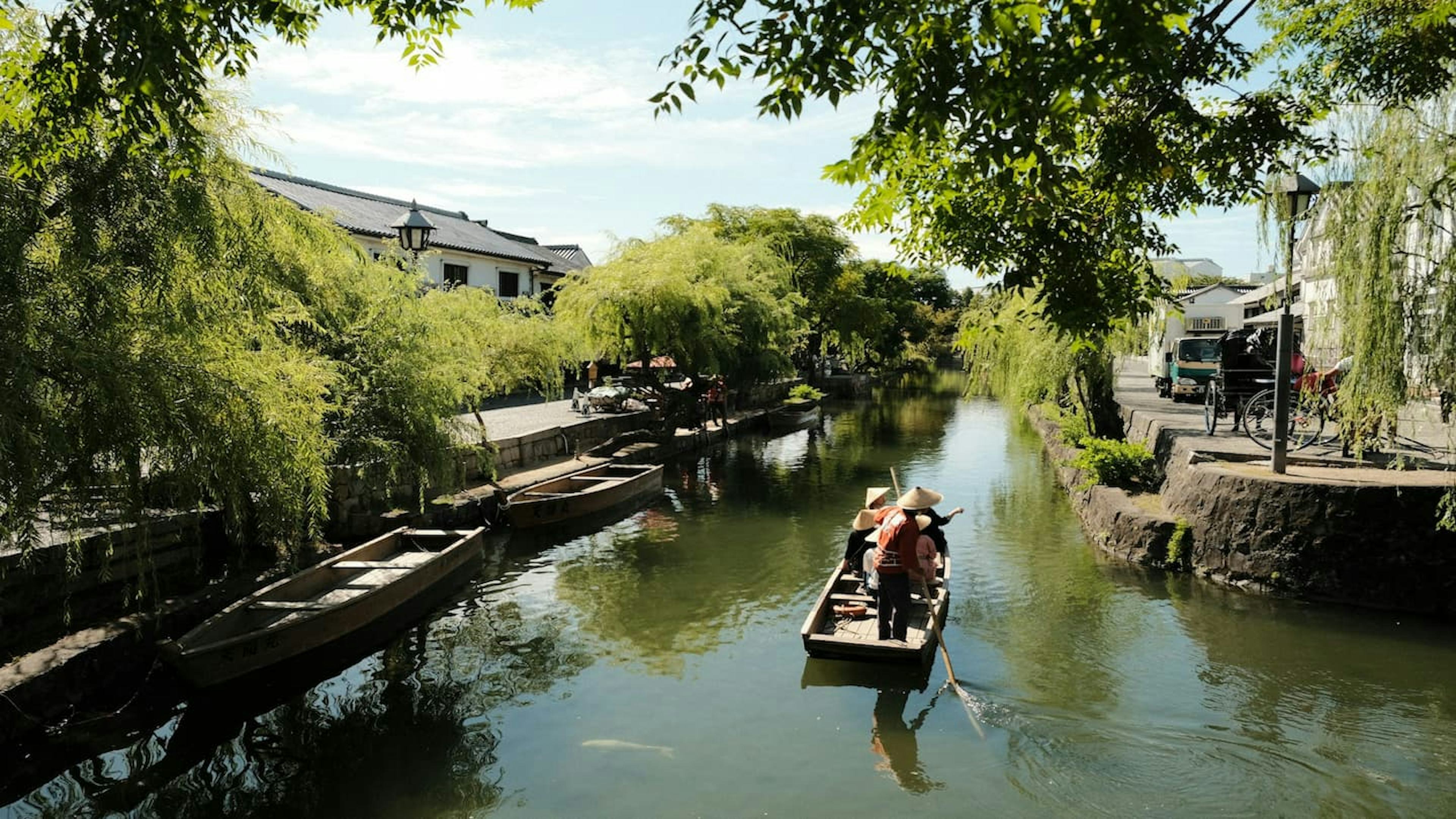 岡山に来たら必ず訪れたい倉敷美観地区は、風情ある空間がどこを切り取っても絵になるような美しいデートスポット。まるで江戸時代にタイムスリップしたかのような風景と、ところどころで見られる枝垂柳(シダレヤナギ)がなんとも心癒やされる空間です。倉敷川をゆったりと下る「くらしき川舟流し」は、水上から白壁の町並みを眺められて人気のアクティビティですよ。