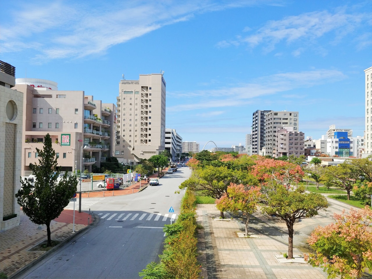 那覇新都心「おもろまち」は、かつて米軍の住宅地だった場所が返還され、再開発によって生まれた近代的な街です。広々とした道路や緑豊かな公園、スタイリッシュな建物が並び、那覇のほかのエリアとは一味違う洗練された雰囲気が魅力!