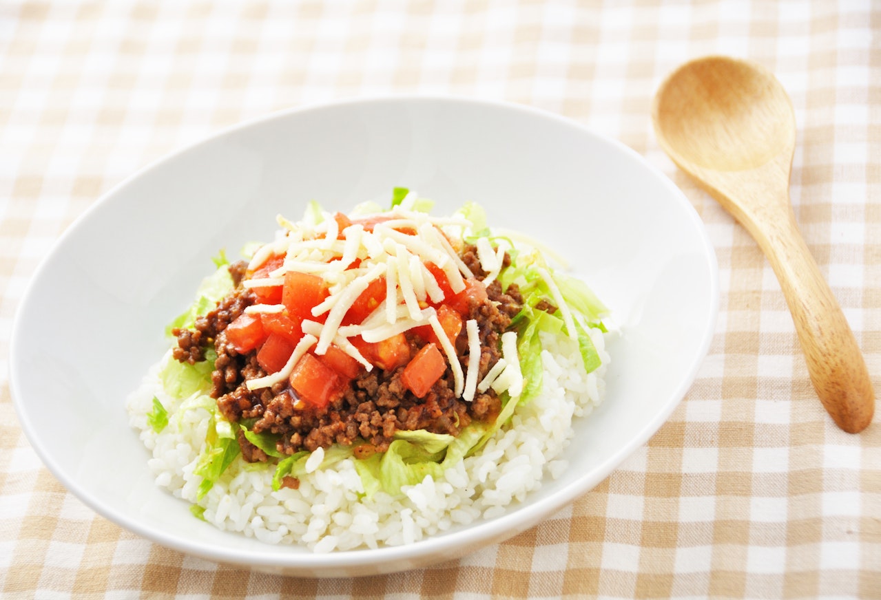 その皮に、スパイシーなひき肉、シャキシャキのレタス、フレッシュなトマト、そしてたっぷりのチーズが包まれており、一口食べれば夢中になること間違いなし。タコライスとタコス、オニオンリングがセットになったプレートメニューもおトクでおすすめです。