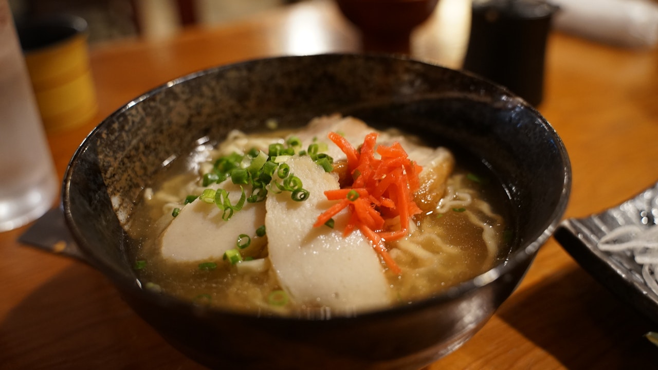 コクがあるのに後味はすっきりしていて、最後の一滴まで飲み干したくなるおいしさです。麺は細麺か平麺をえらべ、トッピングも三枚肉、ソーキ、トロトロなんこつと種類豊富。どれにしようか迷ったら、全部乗せの「けんぱーすば」がおすすめです!