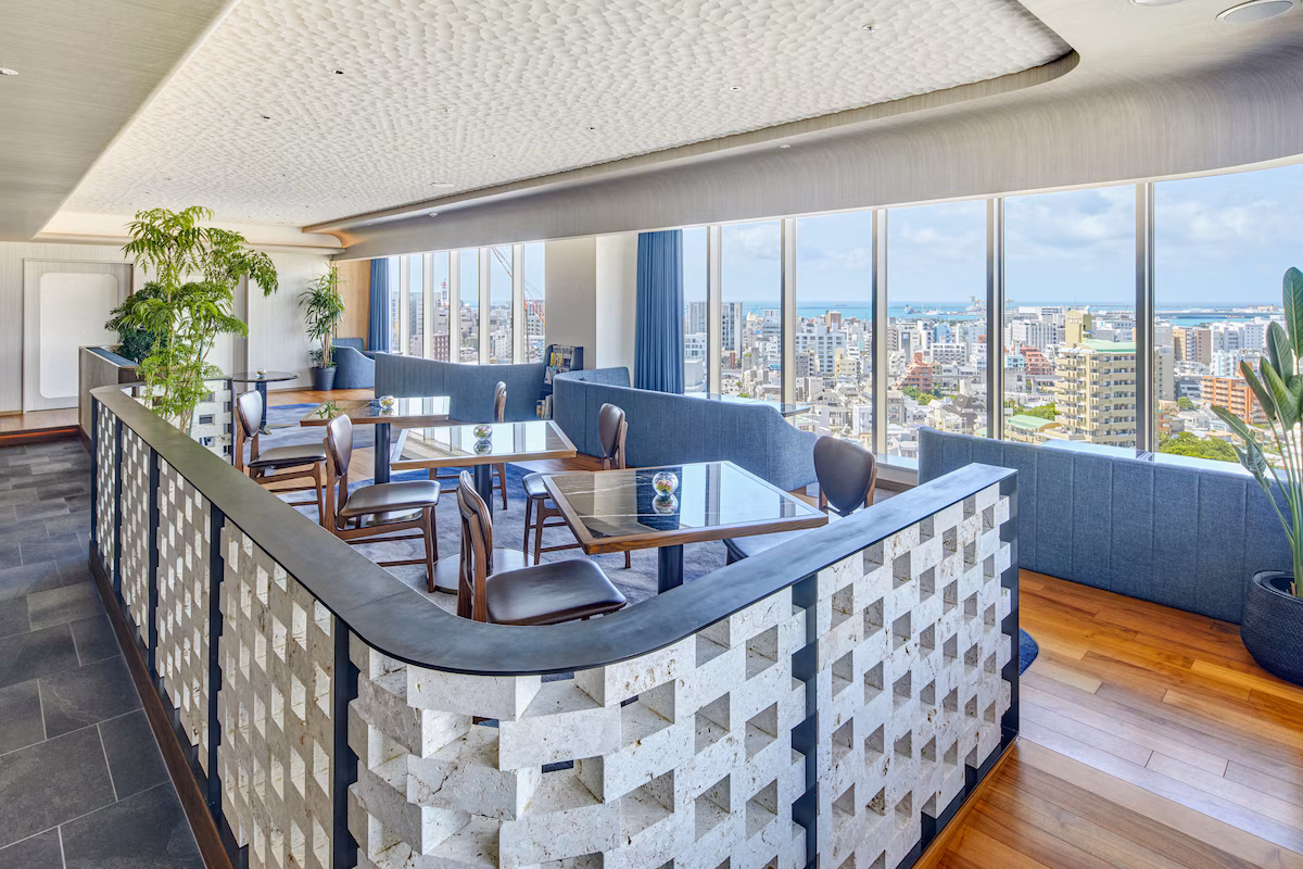 「CAFE STRATA」で爽やかな木漏れ日を浴びながら、モーニングビュッフェで沖縄料理を堪能した後は、最上階に位置するラウンジ「Sky Salon」へ足を運び、那覇の街並みをパノラマで一望できる優雅なアフタヌーンティーを楽しめます。