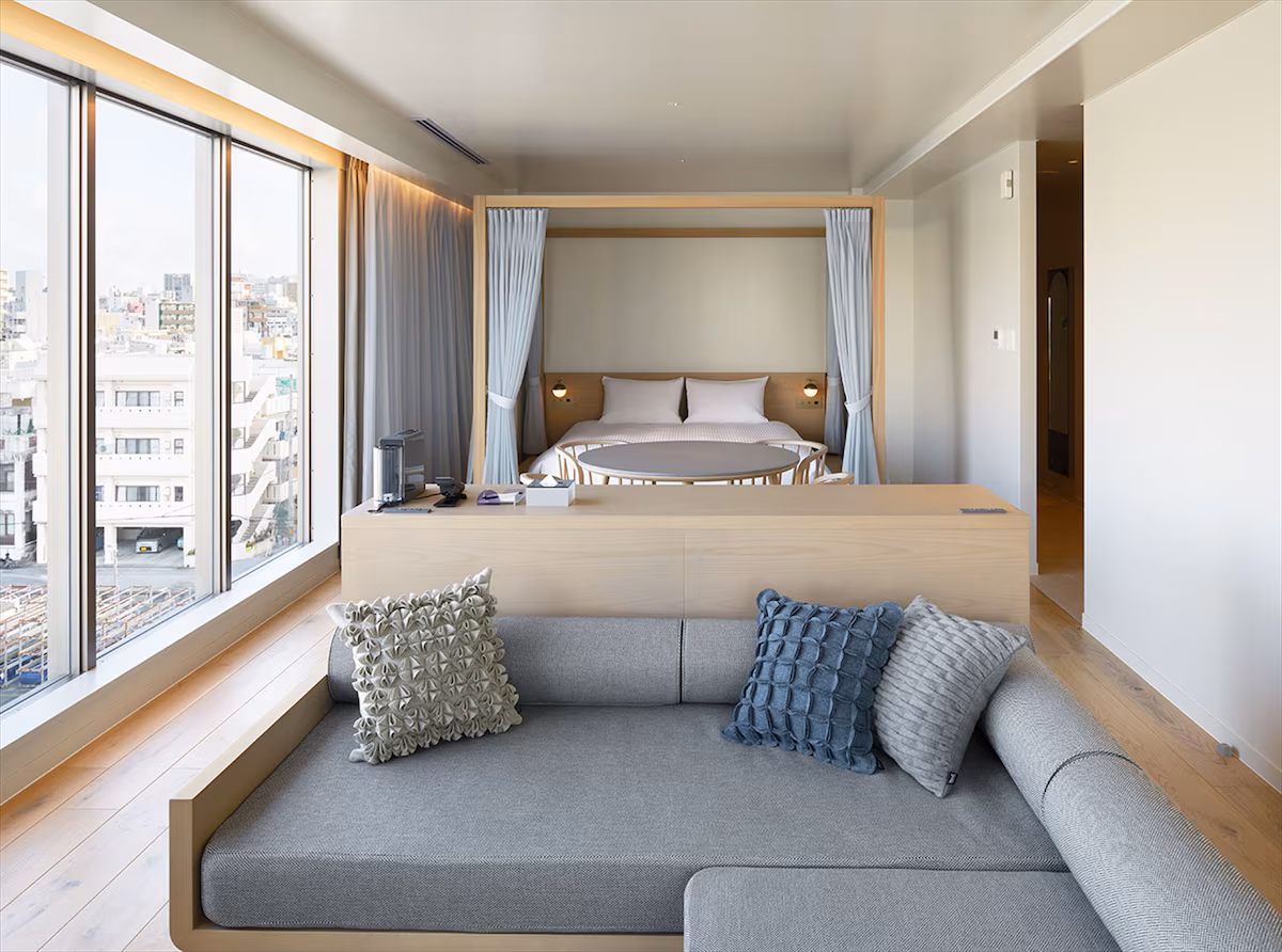 部屋の扉を開けると、那覇市内の一般的なホテルのサイズ感を大きく覆す、30平米以上の広々とした開放的な空間がゲストを出迎えます。深いブルーのカーペットと木の繊細なディテールが調和したインテリアは、どこを撮ってもスタイリッシュでSNS映えする一枚に仕上がります。