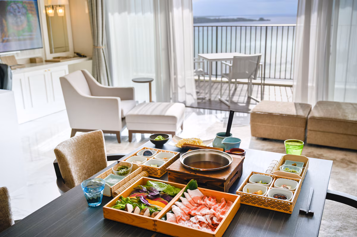 また、お部屋でゆっくり食事を楽しみたい方には「インルームダイニング」も充実しています。特に「あぐー豚のしゃぶしゃぶ」や「手巻き寿司プラン」など、プライベートな空間で周りを気にせず美食を堪能できるメニューが人気です。インルームダイニングの朝食は、1日20食限定で予約が必要ですが、誰にも邪魔されずにテラスで朝食をとる優雅な時間を過ごせます。
