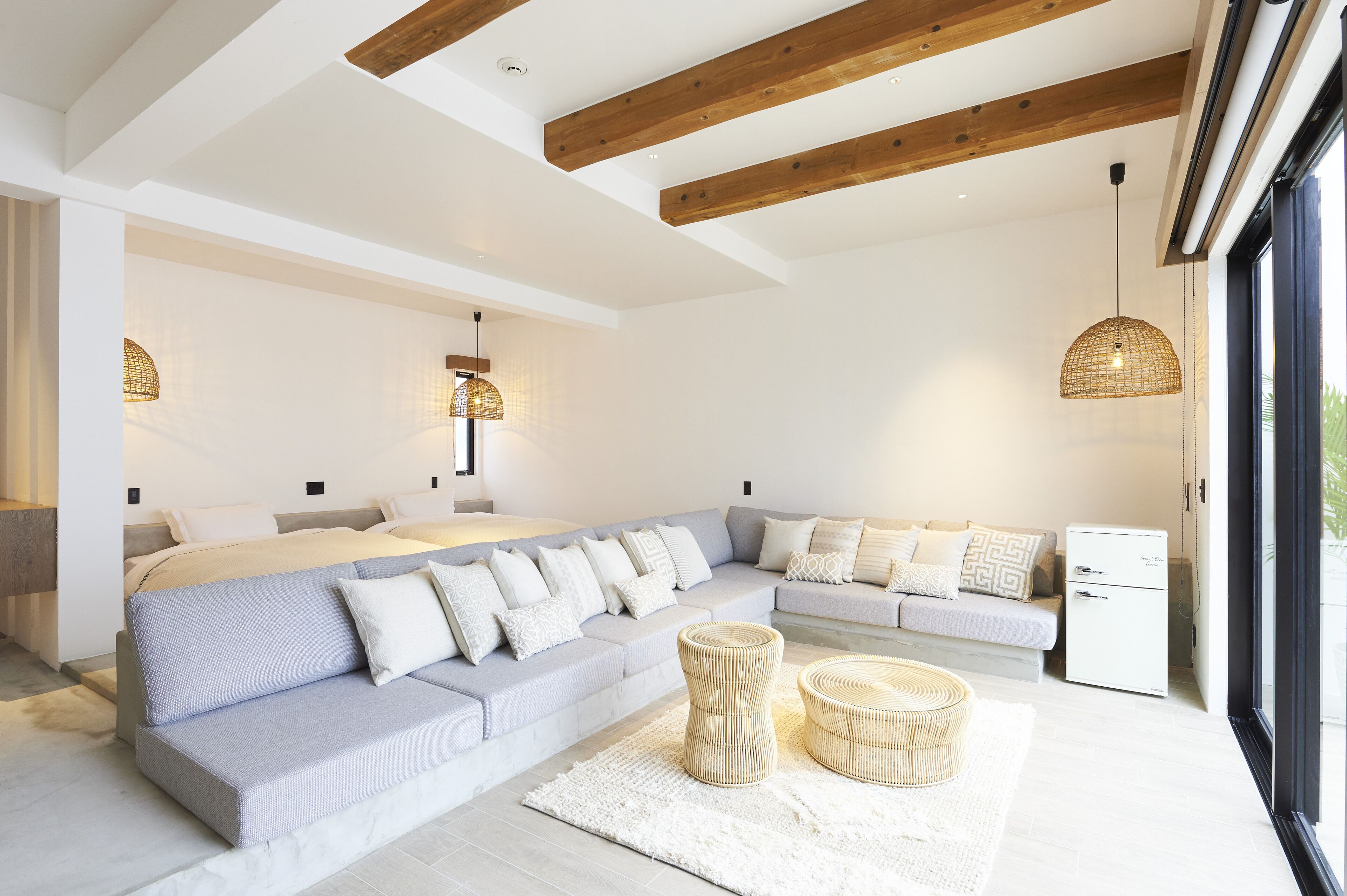 グランブルーギャマンは、全5部屋すべてがプライベートプール付きのスイートヴィラ。フラットで開放感のある設計にこだわり、宮古島のやわらかな風や光を部屋にいながら感じられる心地よい空間が広がります。
