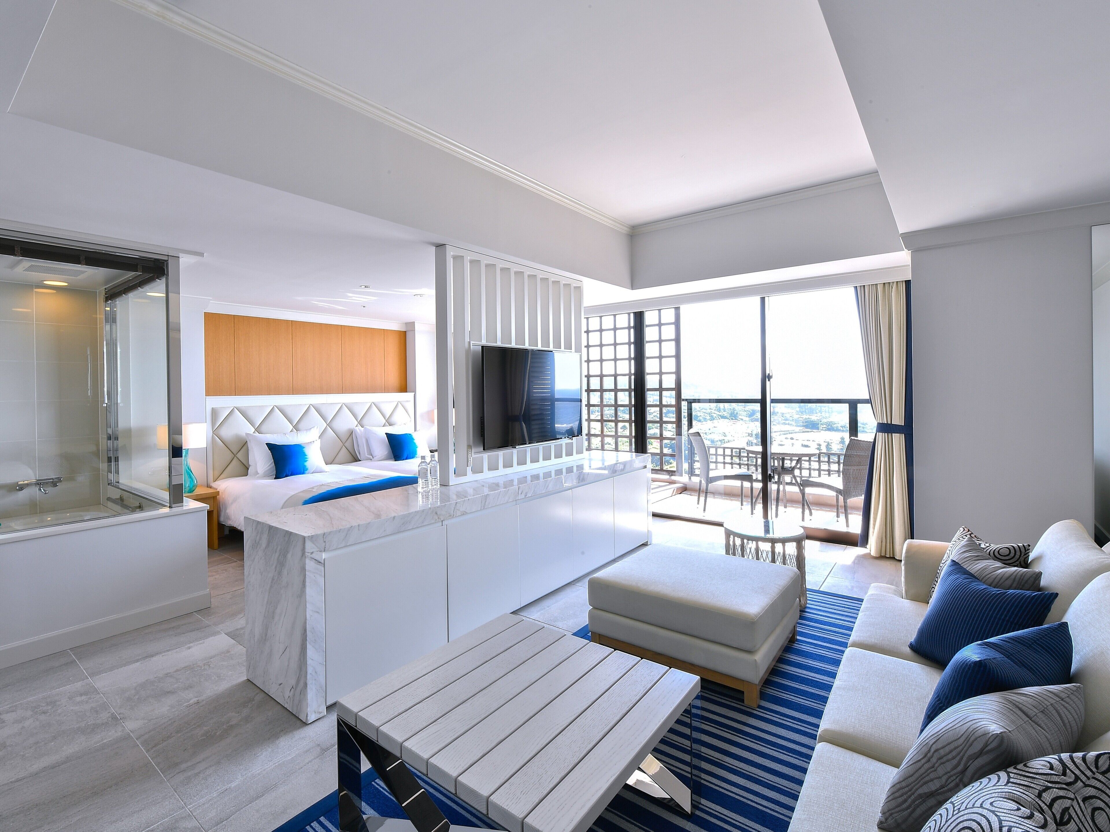 ツインやキングのデラックスルームから、70㎡超えのスイートまでバリエーション豊富!どのお部屋にもプライベートバルコニーが付いており、部屋タイプによって街並みやトゥリバーマリーナ、宮古ブルーの海と伊良部大橋、サンセットなど、少しずつ違う景色を楽しめます。