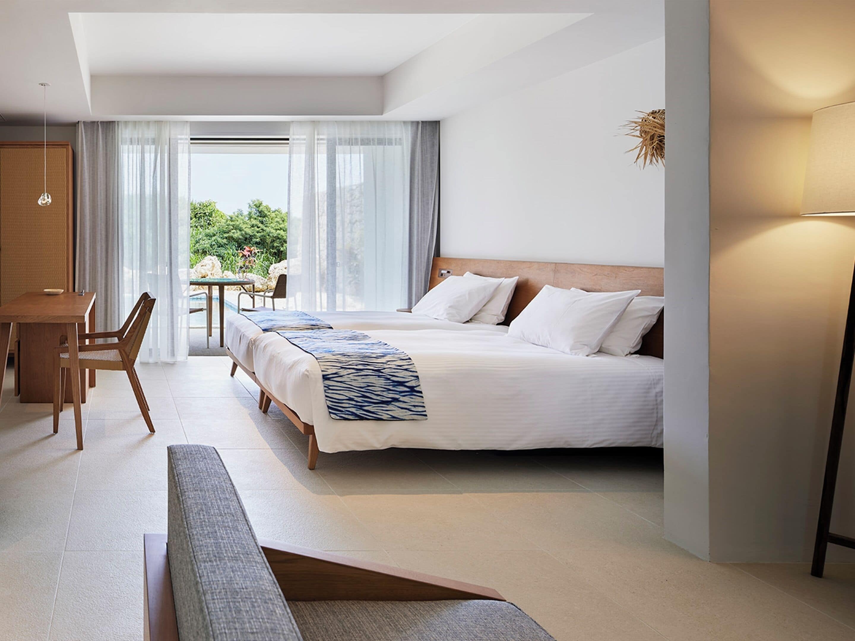 すべてのお部屋に、プライベートプールとテラスを備えたヴィラ&コテージタイプが特徴。大きな窓からは、やわらかな自然光と風が入り込み、お部屋にいながら外の風を感じられるのがポイントです。
