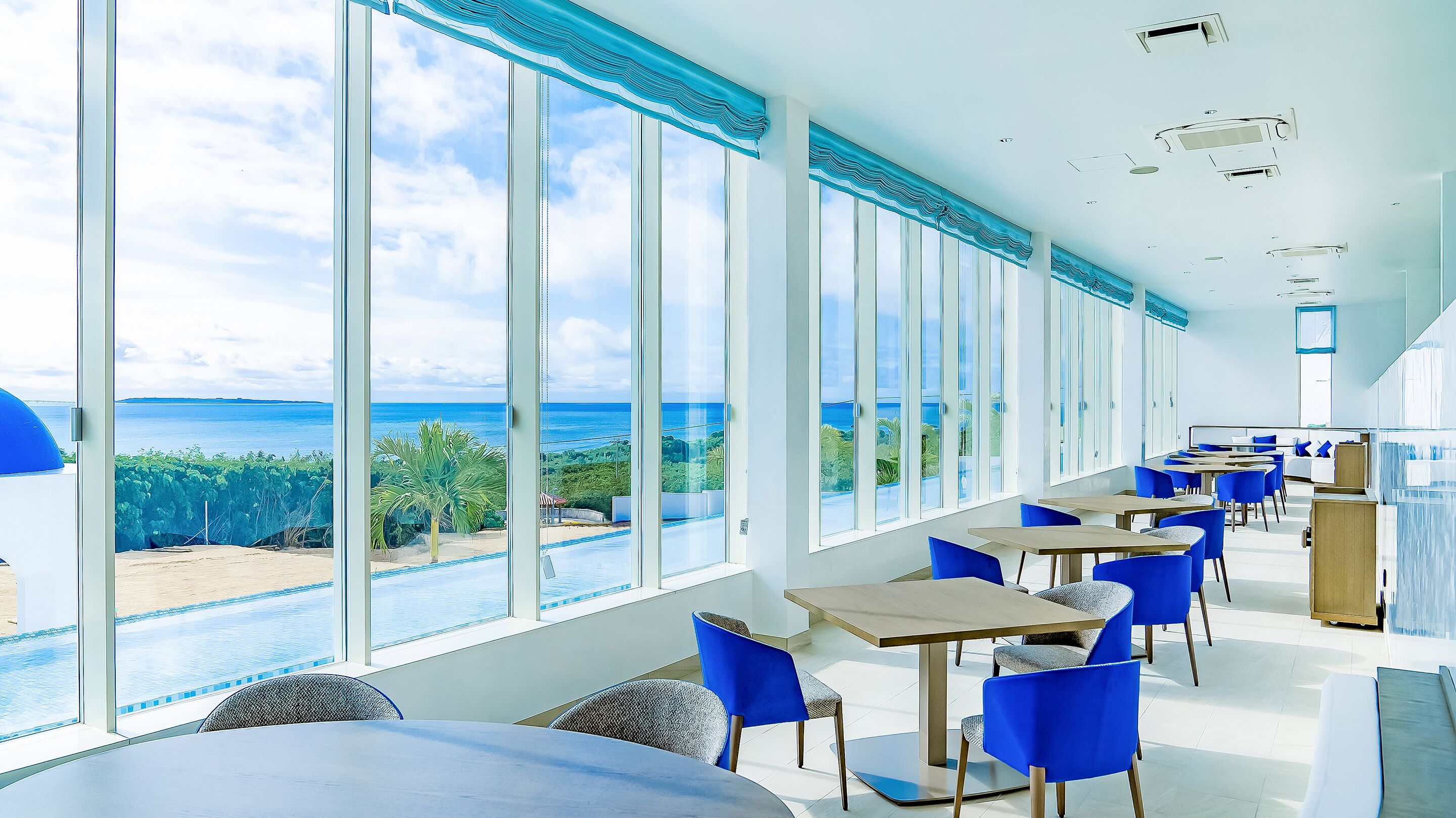 ビーチハウス内のBeach House Restaurantでは、宮古ブルーをイメージした青と白のスタイリッシュな空間で、フレンチとイタリアンをベースにした洋食を提供しています。朝はメインプールを眺めながらの朝食、夜はワインとともにディナーと、一日を通してリゾートらしいダイニングを満喫できますよ。