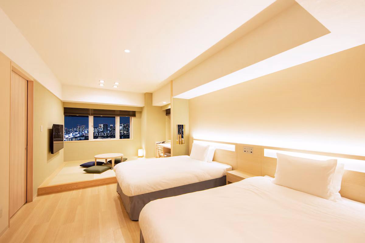さらに、15階以上の高層階にはハイフロアロイヤルグランデルームという特別なお部屋も。42.5㎡の広々とした空間には、160cm幅のワイドベッド2台と、足を伸ばしてくつろげる畳の小上がりスペースがそなえられています。室内には洗濯乾燥機も完備されているので、小さな子ども連れの連泊でも安心ですよ。
