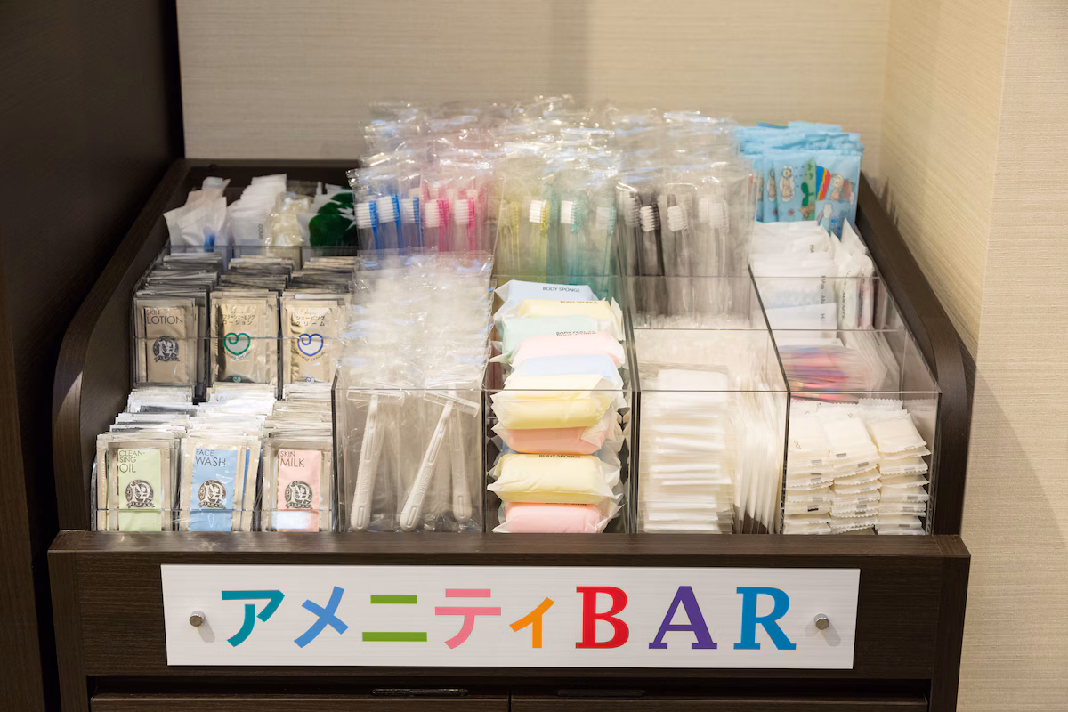 さらに、必要なものを必要なだけ選べる「アメニティBAR」も完備。歯ブラシやカミソリといった基本アイテムだけでなく、入浴剤やスキンケア用品など、女性にも嬉しいアイテムが並びます。最近では環境への配慮から部屋置きのアメニティを減らすホテルが増えていますが、選ぶ楽しさをプラスすることで、エコと満足度を両立させています。