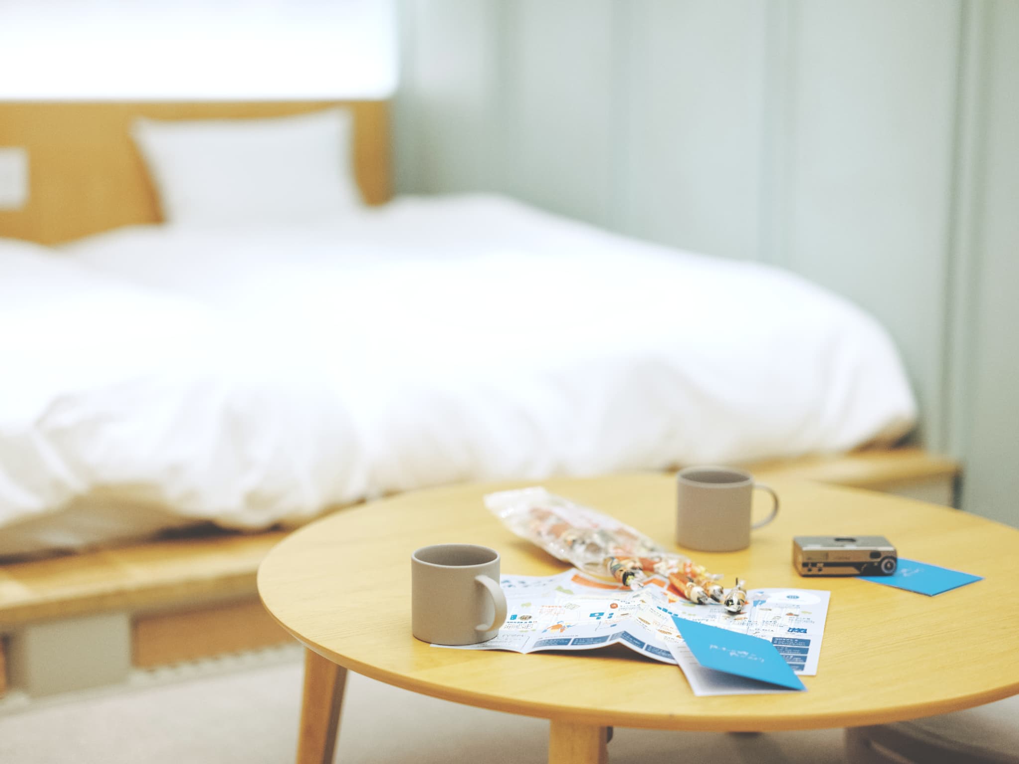 hotel it.osaka shinmachiのお部屋は、生成りのホワイトを基調にしたインテリアと、木のぬくもりを感じるミニマルデザインの家具がそろえられています。お部屋のアクセントにはホテルオリジナルファブリックの「it. tartan」がワンポイント。