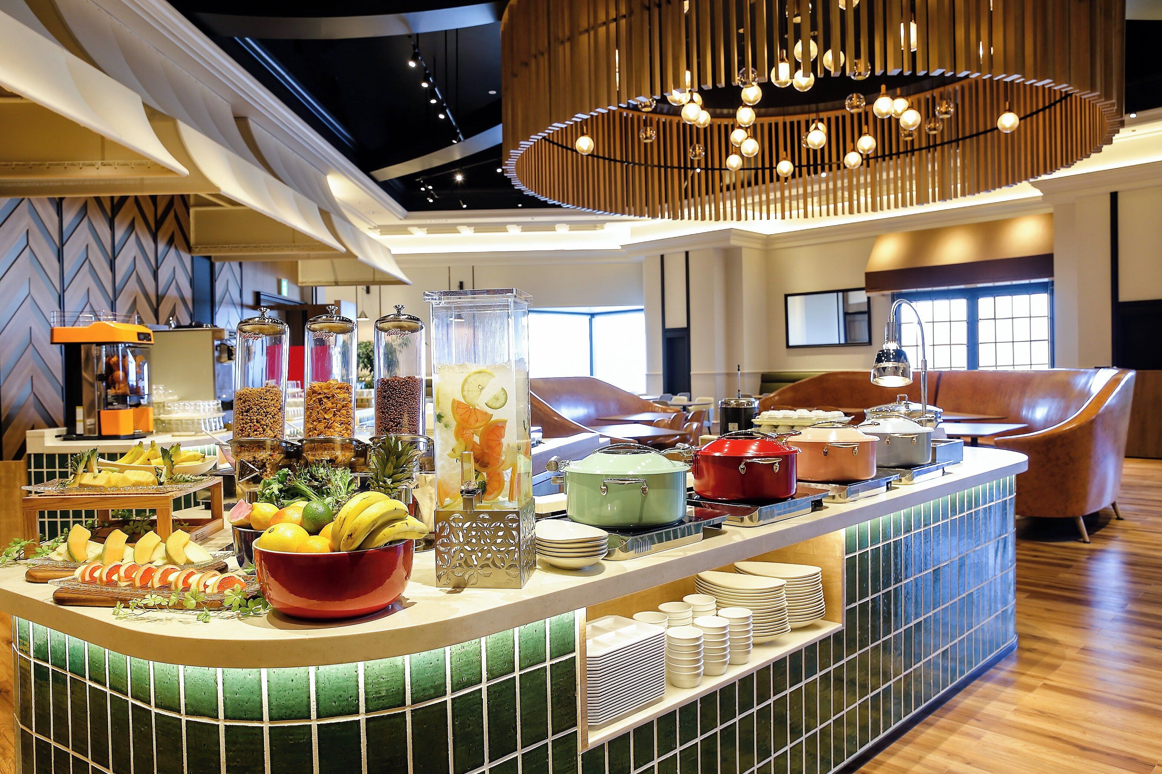 目の前にパークが広がる解放感あふれる空間で、シェフ自慢の料理をビュッフェスタイルで味わえます。ライブキッチンでのダイナミックな調理も必見です!