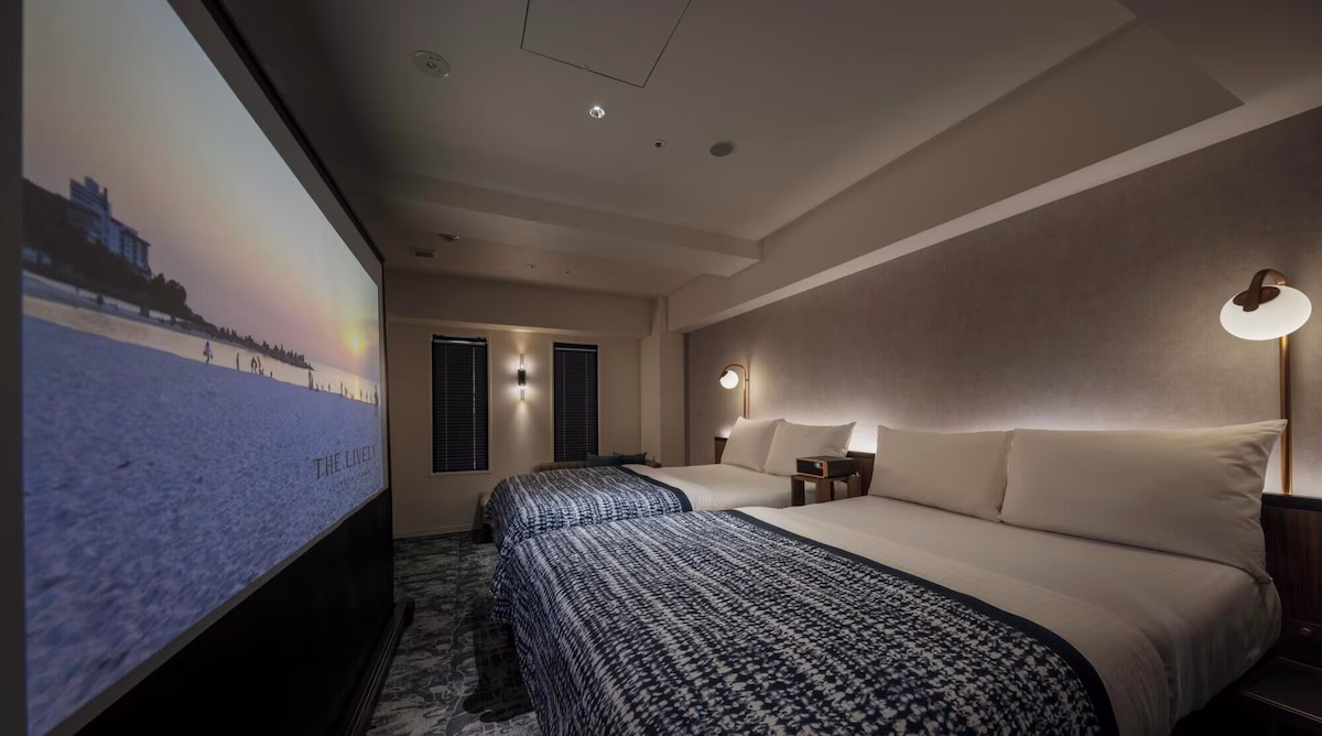 ホテル内は、ゲストの遊び心を刺激するエンタメ感あふれる空間が豊富です。プロジェクターと100インチの巨大スクリーンを完備したシアター仕様の客室では、電動リクライニングベッドを快適なソファとして使い、推しのライブ映像や映画を大迫力で楽しむ、没入感たっぷりの時間が過ごせます。