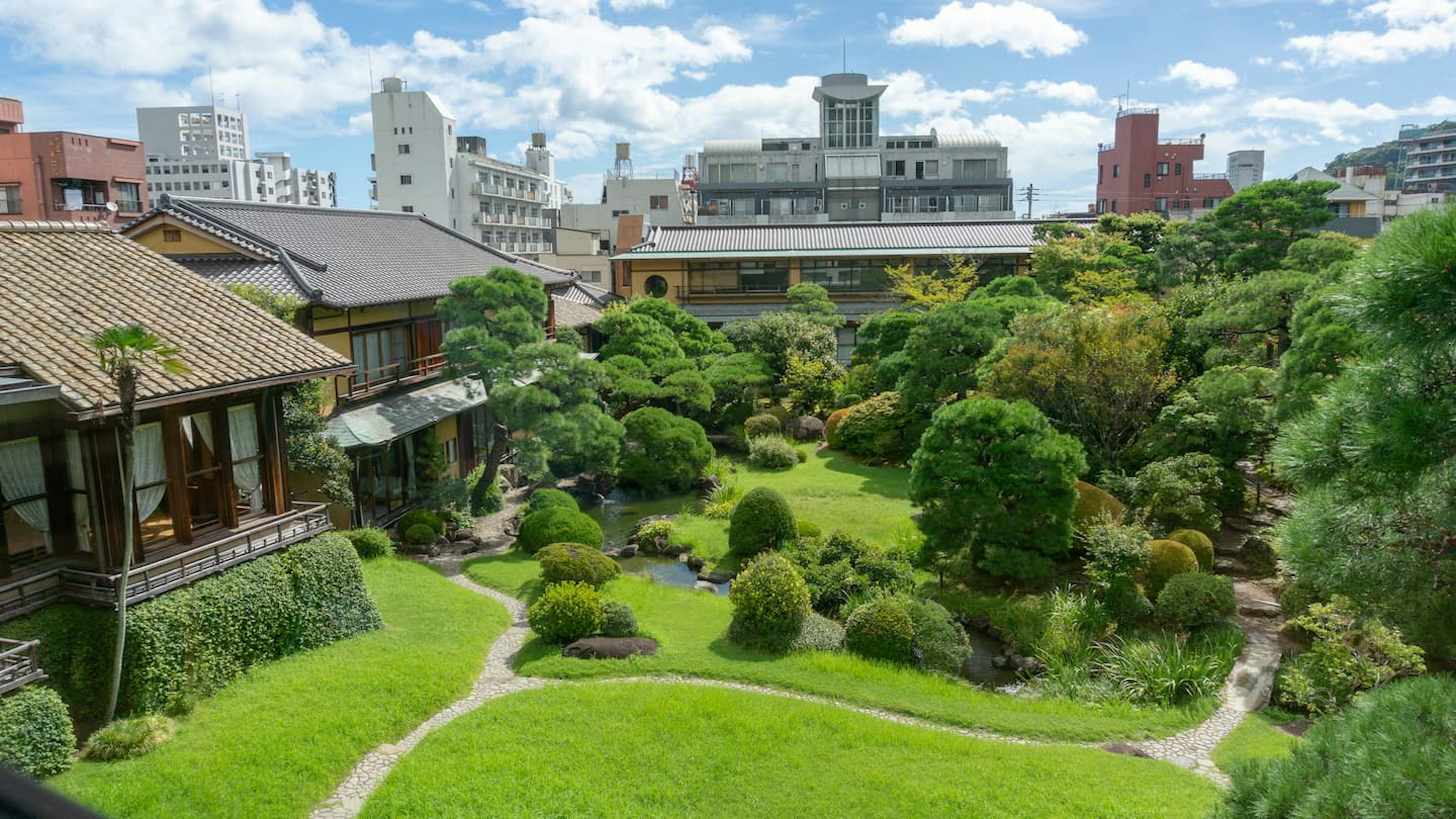 メインロビーの眺めもよく、伊豆諸島や初島などの絶景が広がります。日本庭園である「茶の庭」では、四季折々の花々を楽しむことができ、苔むした小道は散策にぴったり。