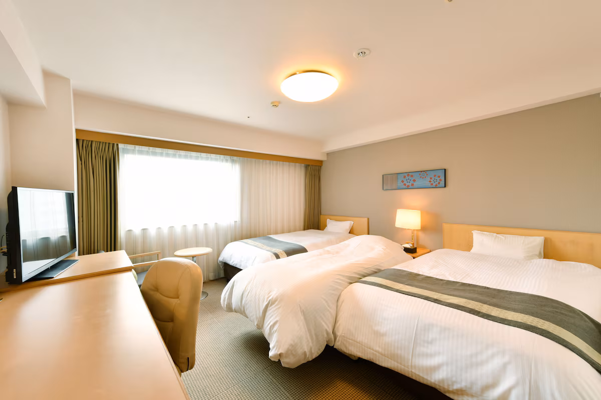 チェックインは14:00、チェックアウトは11:00とゆとりがあるので、朝はゆっくり過ごせます。ツインルームは25㎡の広さでセミダブルベッドが2台あり、ゆったりと過ごせる空間が魅力。