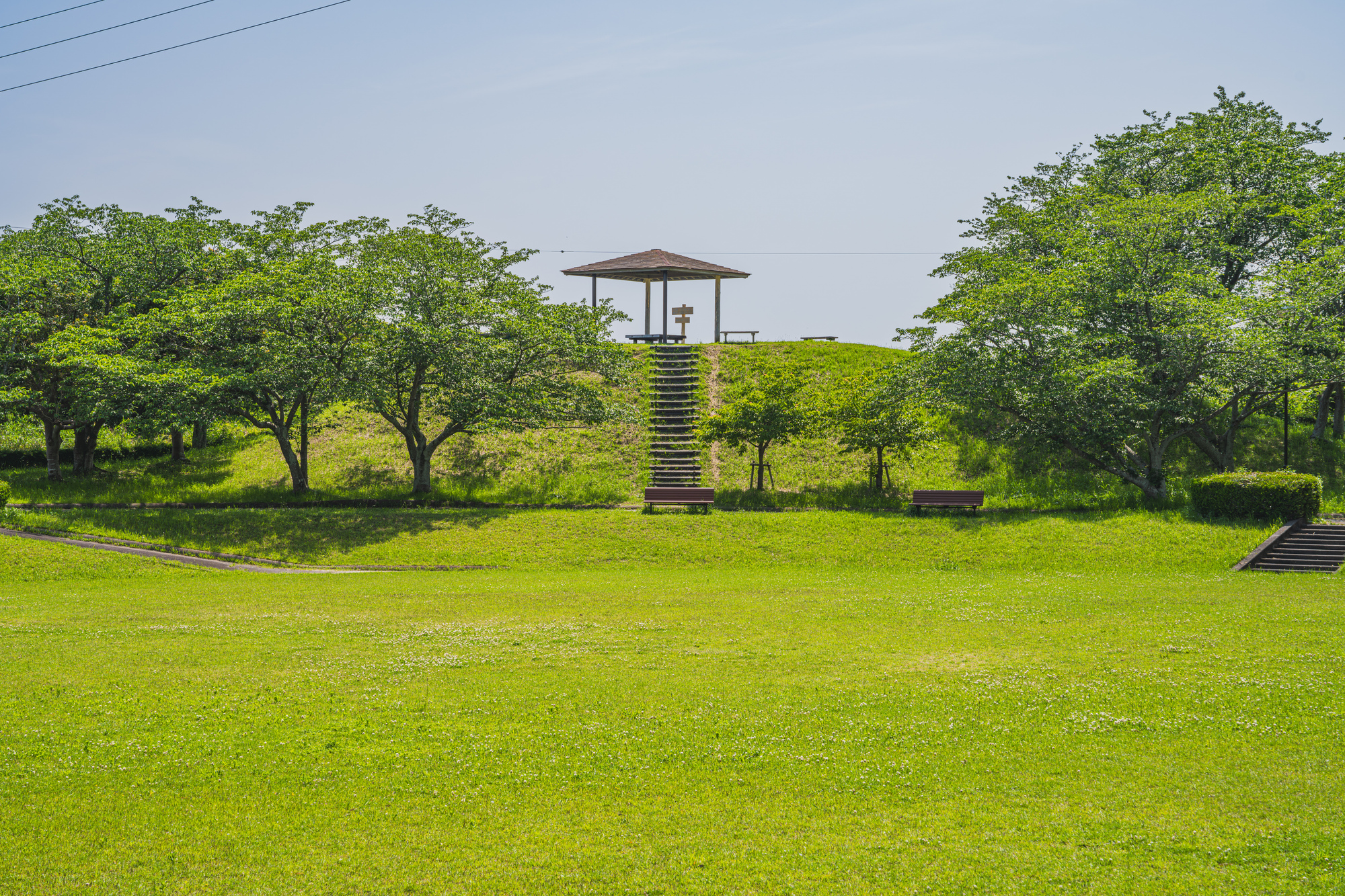 公園の中心には開放感あふれる円形の芝生広場があり、ピクニックやボール遊びにぴったり。展望台のある東屋からは、菊川の市街地がミニチュアのように見渡せます。天気のいい日には、遠くの山々まで見え、その景色は爽快そのもの!