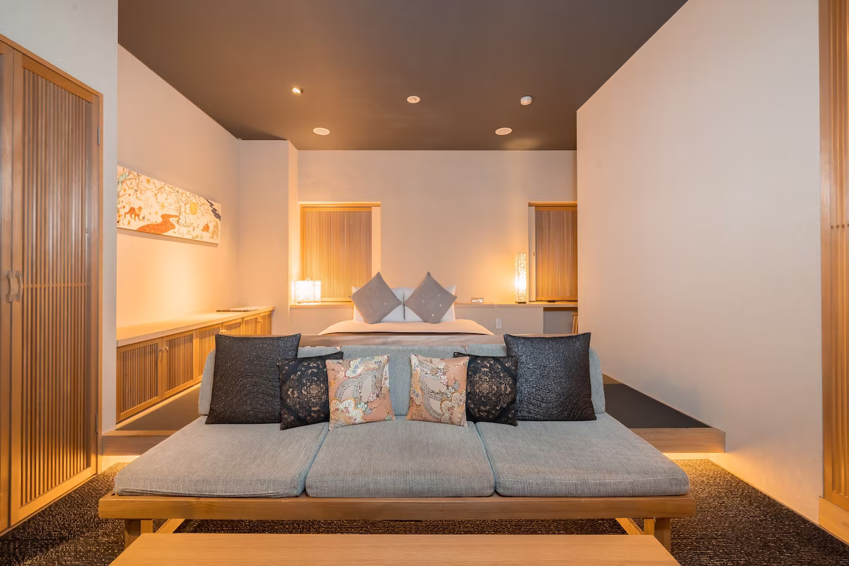 全室44.8平方メートル以上のゆとりあるお部屋は、白木や和紙を基調とした洗練された和モダンの空間。障子越しに差し込むやわらかな自然光が、旅の緊張をそっと解きほぐしてくれますよ。