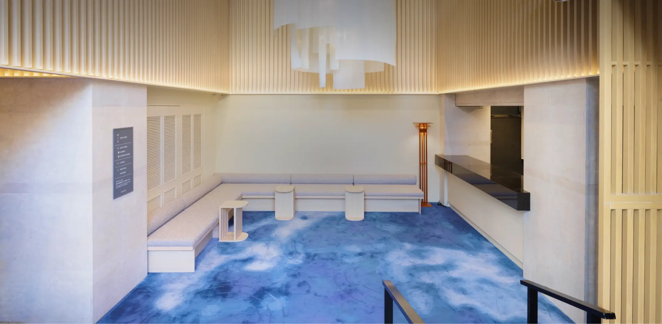 ホテルアマネク浅草桜橋 見どころのひとつとして欠かせないのが、その緻密に計算された空間デザインです。ホテルのすぐそばを滔々と流れる「隅田川」の存在を最大限にリスペクトし、エントランスやロビー、さらには客室の床に至るまで、隅田川の「水面の揺らぎ」をモチーフにしたデザインが巧みに取り入れられています。