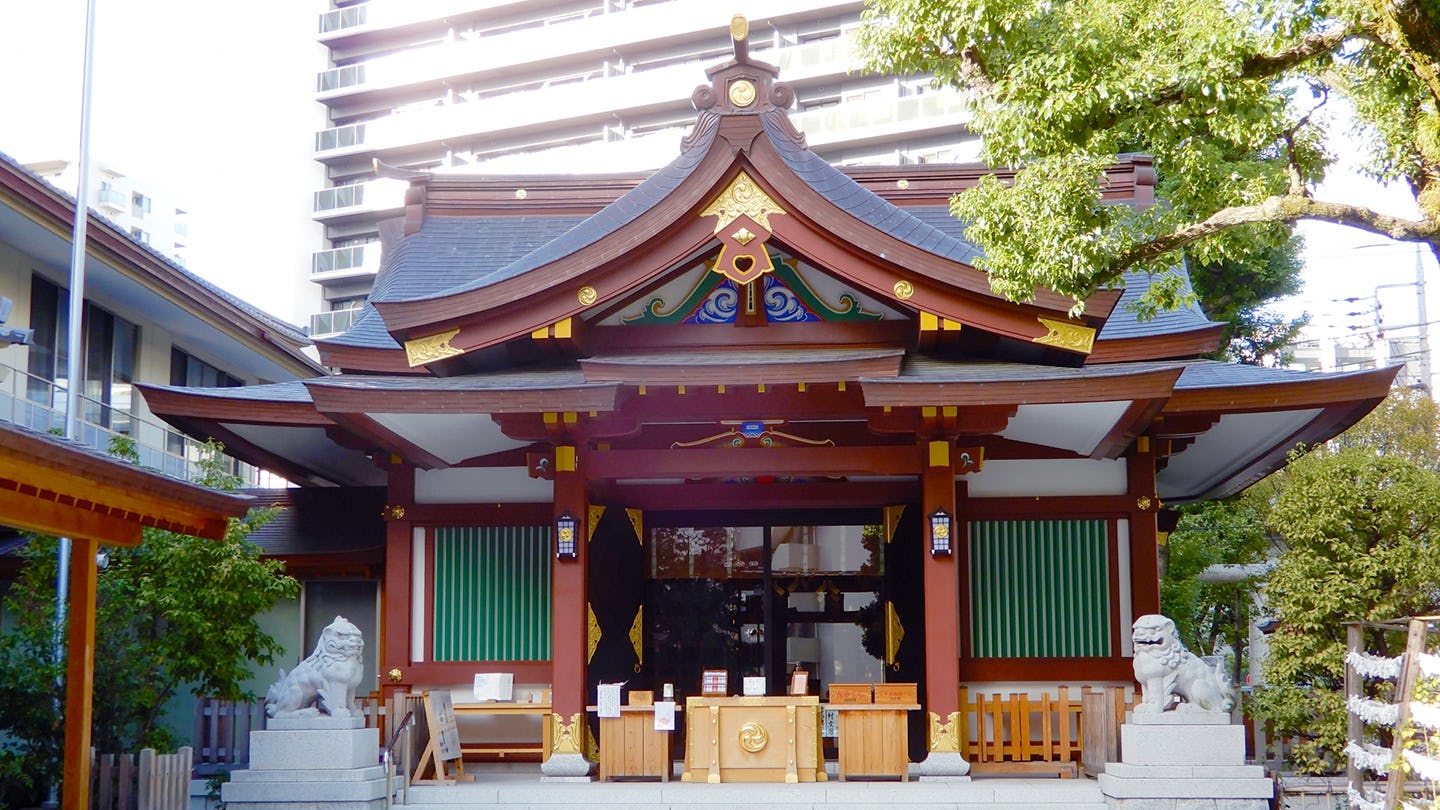 主祭神は誉田別命(応神天皇)で、武運、勝運、殖産興業(商売繁盛)、学問、母子(安産子育)、厄除開運の御神徳があることで有名です。境内には天祖神社や満願火伏稲荷神社などの末社があり、朱色の鳥居が特徴。参道はきれいに整備されており、都市の中にありながら荘厳な雰囲気を醸し出していますよ。