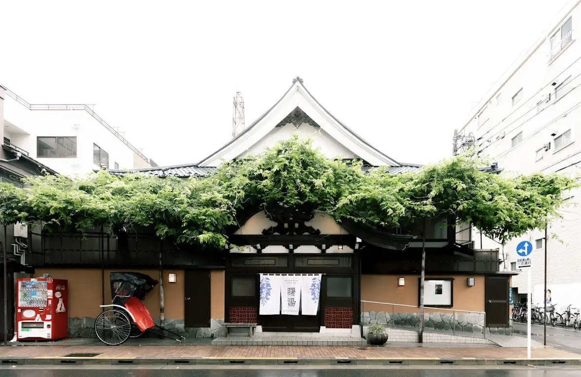 歴史ある宮造りの建築と、藤の花が彩る屋根が目を引き、館内には浅草やスカイツリーが描かれた壁画、格天井、伝統的な番台など、和の美意識や粋な手仕事が生きています。