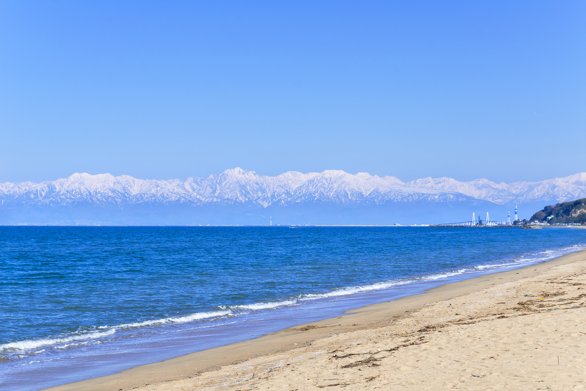 島尾海岸は、うつくしい白砂と青い海が広がる景勝地で、立山連峰を背景にした絶景が楽しめます。夏には海水浴や地引き網体験ができるほか、キャンプ場も併設されており、バーベキューやサイクリングも楽しめます。環境省の「快水浴場百選」にえらばれており、自然を満喫できるスポットです。