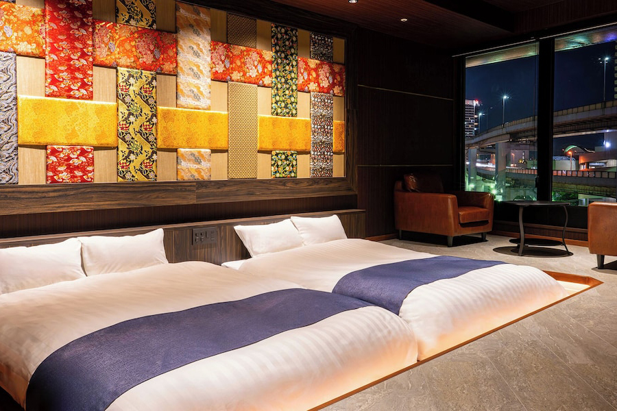 ファミリーロッジ旅籠屋・神戸須磨店のお部屋は、約25平米のゆったりとした空間に、幅154cmのクイーンサイズベッドが2台もそなえ付けられています。