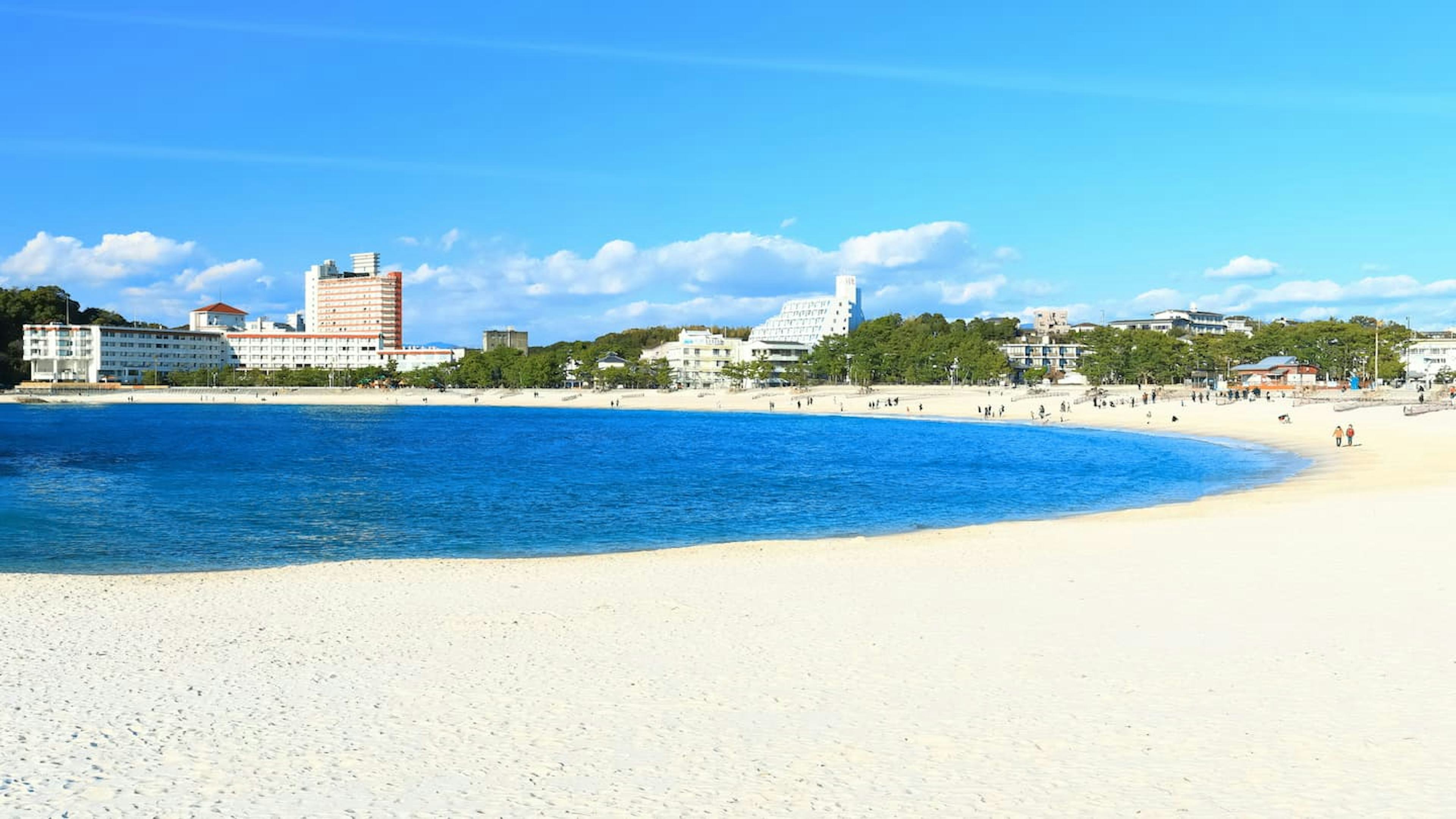 白良浜は、「白浜」の由来にもなった約620mに渡る白い砂浜で有名なスポット。関西屈指のこの美しいビーチは「日本の海水浴場百選」にも選ばれています。
