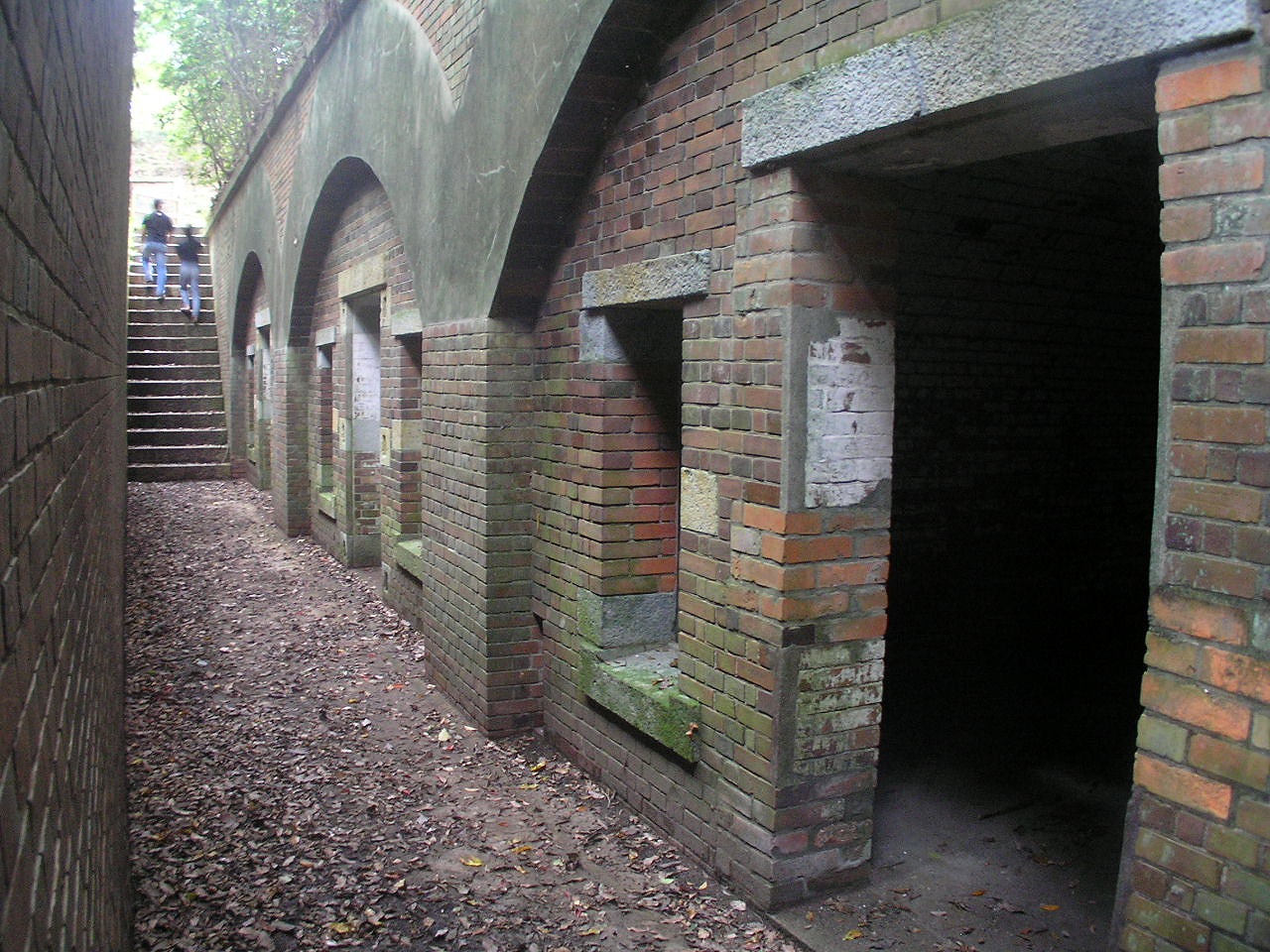 休暇村紀州加太のすぐ近くにあるハイキングコース入口から、木漏れ日が心地よいレンガ敷きの小道を進むこと約5分。目の前に、緑に覆われた重厚な砲台跡が現れます。静寂に包まれた空間は、まるで時が止まっているかのよう。