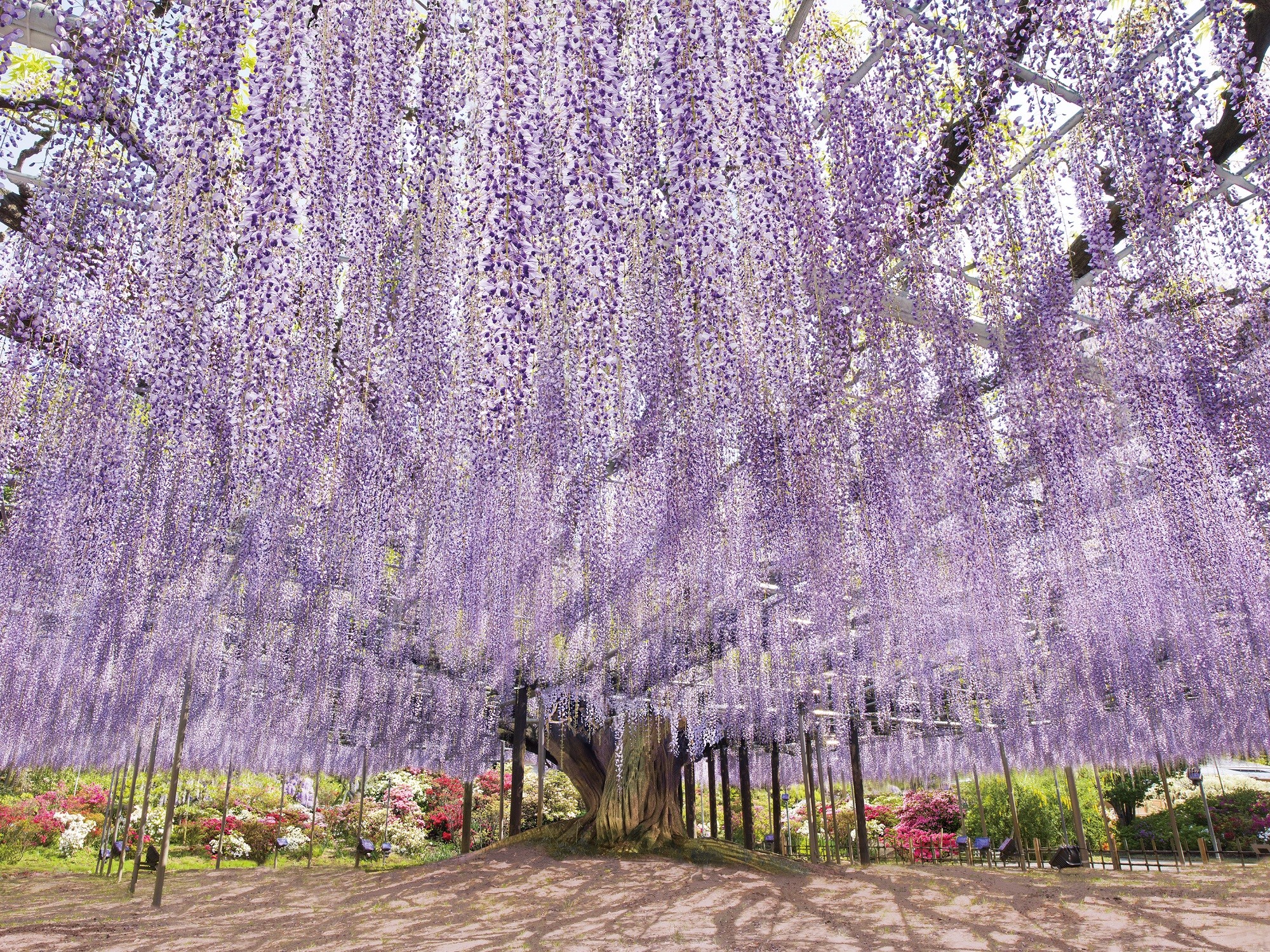 足利市の「あしかがフラワーパーク」は、CNNから「世界の夢の旅行先」に選ばれたこともある、世界基準の春絶景で知られる場所です。なかでも樹齢160年を超える大藤の棚は圧巻で、約600畳もの広さに広がります。夜のライトアップでは、紫の花が雨のように降り注ぐ幻想的な光景が広がります。